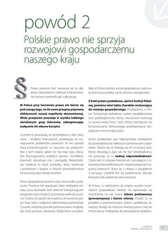 łoby to Polsce szybszy wzrost gospodarczy i automatycznie przyczyniłoby się do wzrostu wynagrodzeń. Z kolei prawo podatkowe, oprócz funkcji fiskalnej, powinno mieć także charakter motywujący do rozwoju gospodarczego. Przykładowo, w Polsce funkcjonuje jednakowy system opodatkowania tych przedsiębiorców, którzy nieustannie inwestują w rozwój swojej firmy i tych, którzy zniechęceni do kontynuowania biznesowego przedsięwzięcia skupiają się na konsumpcji zysku. Innym problemem jest nieprzychylne nastawienie do przedsiębiorców niektórych państwowych urzędników. Zdarza się, że stawiają się oni w pozycji tych, którzy decydują o „być, lub nie być” przedsiębiorcy, nie ponosząc za to żadnej odpowiedzialności. Często jest to przejaw bezradności wynikającej z interpretacji skomplikowanych i niejednoznacznych regulacji prawnych. Bywa że, z obawy o posądzenie o korupcję, urzędnik boi się podejmować decyzje korzystne dla wspólnoty ekonomicznej. W Polsce, w odróżnieniu do krajów wysoko rozwiniętych gospodarczo, niestety nie wprowadza się rozróżnienia na tak zwany biznes podstawowy (prorozwojowy) i biznes wtórny. Chodzi tu na przykład o proinwestycyjny system podatkowy, łatwiejszy dostęp do terenów inwestycyjnych oraz do infrastruktury niezbędnej do prowadzenia działalno-
