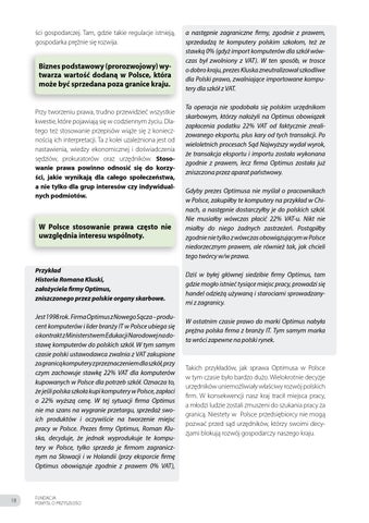 Przykład Historia Romana Kluski, założyciela firmy Optimus, zniszczonego przez polskie organy skarbowe. Jest 1998 rok. Firma Optimus z Nowego Sącza – producent komputerów i lider branży IT w Polsce ubiega się o kontrakt z Ministerstwem Edukacji Narodowej na dostawę komputerów do polskich szkół. W tym samym czasie polski ustawodawca zwalnia z VAT zakupione za granicą komputery z przeznaczeniem dla szkół, przy czym zachowuje stawkę 22% VAT dla komputerów kupowanych w Polsce dla potrzeb szkół. Oznacza to, że jeśli polska szkoła kupi komputery w Polsce, zapłaci o 22% wyższą cenę. W tej sytuacji firma Optimus nie ma szans na wygranie przetargu, sprzedaż swoich produktów i oczywiście na tworzenie miejsc pracy w Polsce. Prezes firmy Optimus, Roman Kluska, decyduje, że jednak wyprodukuje te komputery w Polsce, tylko sprzeda je firmom zagranicznym na Słowacji i w Holandii (przy eksporcie firmę Optimus obowiązuje zgodnie z prawem 0% VAT),