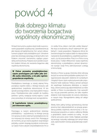 mi wielka firma, żebym miał tylko wielkie kłopoty? Nie służy to budowaniu silnych rodzimych firm globalnych i naszej gospodarce. Negatywny klimat do tworzenia bogactwa wpływa także na nieprzychylne nastawienie do przedsiębiorcy, urzędników państwowych, czy też pracowników. Przez to w Polsce rosną koszty pracy i maleje efektywność naszej wspólnoty ekonomicznej, a przedsiębiorcy zamiast dynamicznie rozwijać swoje firmy zdemotywowani uciekają w konsumpcję. Niestety w Polsce są grupy interesów, które odnoszą korzyści ze wzmacniania podziałów społecznych. Antagonizowanie obywateli i dzielenie ich na biednych i bogatych bywa często wykorzystywane jako populistyczne hasło wyborcze. Politycy zamiast zachęcać do wspólnego budowania dobrobytu w naszym kraju, celowo przerzucają odpowiedzialność za niskie zarobki w Polsce na pracodawców. Czas wyzwolić się z tej gry przeciwko państwu, bo tylko wspólne działanie może doprowadzić do wzrostu dobrobytu w naszym kraju. Wynagrodzenia zależą od całego społeczeństwa. Media, które pełnią funkcję opiniotwórczą również powinny brać odpowiedzialność za sytuację gospodarczą polskiej wspólnoty ekonomicznej a nie wykorzystywać populizmu w walce o odbiorcę. Wiedza o gospodarce, często uważana za nudną, nie jest chętnie poruszana przez media. Najlepiej sprzedaje się sensację i rozrywkę, wybierając tym samym łatwy zysk, często kosztem rozwoju gospodarczego wspólnoty. FUNDACJA POMYŚL O PRZYSZŁOŚCI