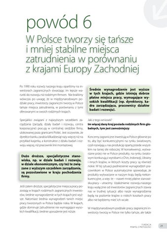 Średnie wynagrodzenie jest wyższe w tych krajach, gdzie istnieją dobrze płatne miejsca pracy, wymagające wysokich kwalifikacji (np. dyrektorzy, kadra zarządzająca, pracownicy działów badań i rozwoju). Jaki z tego wniosek? Im więcej dany kraj posiada rodzimych firm globalnych, tym jest zamożniejszy. Koncerny zagraniczne inwestują w Polsce głównie po to, aby być konkurencyjnymi na rynku światowym, czyli rozwijają u nas produkcję opartą przede wszystkim na taniej sile roboczej. W konsekwencji, wytwarzane przez nie w Polsce produkty, na rynku światowym konkurują z wyrobami z Chin, Indonezji, Ukrainy i innych krajów, w których koszty pracy są również niskie. W tej sytuacji podniesienie wynagrodzeń pracownikom w Polsce automatycznie spowoduje, że produkty wytwarzane w naszym kraju będą niekonkurencyjne, a więc te – nawet mniej płatne stanowiska pracy – utracimy. Uzależnienie rozwoju naszego kraju wyłącznie od inwestorów zagranicznych stawia nas w trudnej sytuacji: albo nasze wynagrodzenia będą na poziomie krajów o niskich kosztach pracy albo nie będziemy mieć ich wcale. W międzynarodowym podziale pracy zagraniczni inwestorzy tworzą w Polsce nie tylko tańsze, ale także