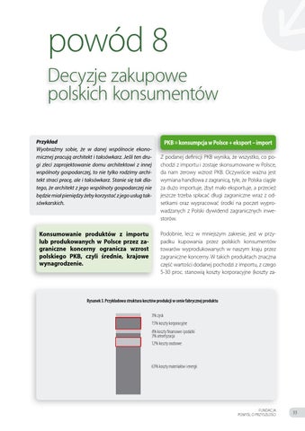 PKB = konsumpcja w Polsce + eksport – import Z podanej definicji PKB wynika, że wszystko, co pochodzi z importu i zostaje skonsumowane w Polsce, da nam zerowy wzrost PKB. Oczywiście ważna jest wymiana handlowa z zagranicą, tyle, że Polska ciągle za dużo importuje, zbyt mało eksportuje, a przecież jeszcze trzeba spłacać długi zagraniczne wraz z odsetkami oraz wypracować środki na poczet wyprowadzanych z Polski dywidend zagranicznych inwestorów. Podobnie, lecz w mniejszym zakresie, jest w przypadku kupowania przez polskich konsumentów towarów wyprodukowanych w naszym kraju przez zagraniczne koncerny. W takich produktach znaczna część wartości dodanej pochodzi z importu, z czego 5-30 proc. stanowią koszty korporacyjne (koszty za-