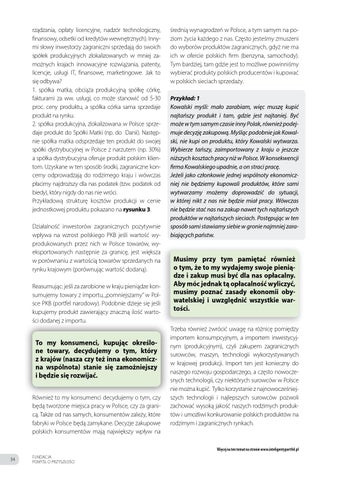 rządzania, opłaty licencyjne, nadzór technologiczny, finansowy, odsetki od kredytów wewnętrznych). Innymi słowy inwestorzy zagraniczni sprzedają do swoich spółek produkcyjnych zlokalizowanych w mniej zamożnych krajach innowacyjne rozwiązania, patenty, licencje, usługi IT, finansowe, marketingowe. Jak to się odbywa? 1. spółka matka, obciąża produkcyjną spółkę córkę, fakturami za ww. usługi, co może stanowić od 5-30 proc. ceny produktu, a spółka córka sama sprzedaje produkt na rynku. 2. spółka produkcyjna, zlokalizowana w Polsce sprzedaje produkt do Spółki Matki (np. do Danii). Następnie spółka matka odsprzedaje ten produkt do swojej spółki dystrybucyjnej w Polsce z narzutem (np. 30%) a spółka dystrybucyjna oferuje produkt polskim klientom. Uzyskane w ten sposób środki, zagraniczne koncerny odprowadzają do rodzimego kraju i wówczas płacimy najdroższy dla nas podatek (tzw. podatek od biedy), który nigdy do nas nie wróci. Przykładową strukturę kosztów produkcji w cenie jednostkowej produktu pokazano na rysunku 3. Działalność inwestorów zagranicznych pozytywnie wpływa na wzrost polskiego PKB jeśli wartość wyprodukowanych przez nich w Polsce towarów, wyeksportowanych następnie za granicę, jest większa w porównaniu z wartością towarów sprzedanych na rynku krajowym (porównując wartość dodaną). Reasumując: jeśli za zarobione w kraju pieniądze konsumujemy towary z importu, „pomniejszamy” w Polsce PKB (portfel narodowy). Podobnie dzieje się jeśli kupujemy produkt zawierający znaczną ilość wartości dodanej z importu.
