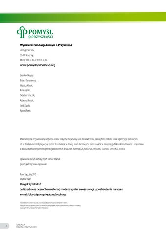 Materiał został przygotowany w oparciu o dane statystyczne, analizy oraz doświadczenia polskiej firmy FAKRO, która w przeciągu pierwszych 20 lat działalności zdobyła pozycję numer 2 na świecie w branży okien dachowych. Treści zawarte w niniejszej publikacji konsultowano i uzupełniano o doświadczenia innych firm i przedsiębiorców m.in. BARLINEK, KOMANDOR, KONSPOL, OPTIMUS, SOLARIS, SYNTHOS, WIMED. opracowanie danych statystycznych: Tomasz Adamek projekt graficzny: Anna Krężelewska Nowy Sącz, luty 2015 Wydanie piąte Drogi Czytelniku! Jeśli zechcesz ocenić ten materiał, możesz wysłać swoje uwagi i spostrzeżenia na adres e-mail: biuro@pomysloprzyszlosci.org Autorzy dołożyli wszelkich starań, by zawarte w publikacji informacje były kompletne i rzetelne. Autorzy nie ponoszą odpowiedzialności za ewentualne szkody wynikłe z wykorzystania informacji zawartych w publikacji. Copyright © Fundacja Pomyśl o Przyszłości