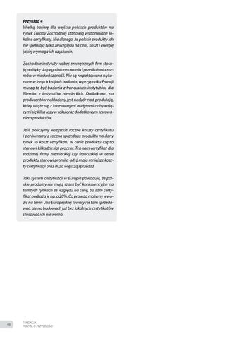 Przykład 4 Wielką barierę dla wejścia polskich produktów na rynek Europy Zachodniej stanowią wspomniane lokalne certyfikaty. Nie dlatego, że polskie produkty ich nie spełniają tylko ze względu na czas, koszt i energię jakiej wymaga ich uzyskanie. Zachodnie instytuty wobec zewnętrznych firm stosują politykę skąpego informowania i przedłużania rozmów w nieskończoność. Nie są respektowane wykonane w innych krajach badania, w przypadku Francji muszą to być badania z francuskich instytutów, dla Niemiec z instytutów niemieckich. Dodatkowo, na producentów nakładany jest nadzór nad produkcją, który wiąże się z kosztownymi audytami odbywającymi się kilka razy w roku oraz dodatkowym testowaniem produktów. Jeśli policzymy wszystkie roczne koszty certyfikatu i porównamy z roczną sprzedażą produktu na dany rynek to koszt certyfikatu w cenie produktu często stanowi kilkadziesiąt procent. Ten sam certyfikat dla rodzimej firmy niemieckiej czy francuskiej w cenie produktu stanowi promile, gdyż mają mniejsze koszty certyfikacji oraz dużo większą sprzedaż. Taki system certyfikacji w Europie powoduje, że polskie produkty nie mają szans być konkurencyjne na tamtych rynkach ze względu na cenę, bo sam certyfikat podraża je np. o 20%. Co prawda możemy wwozić na teren Unii Europejskiej towary i je tam sprzedawać, ale na budowach już bez lokalnych certyfikatów stosować ich nie wolno.