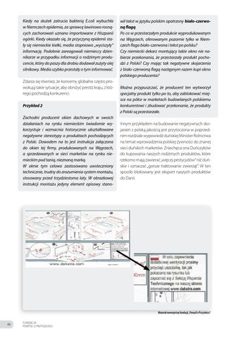 wił tekst w języku polskim opatrzony biało-czerwoną flagą. Po co w przestarzałym produkcie wyprodukowanym na Węgrzech, oferowanym pozornie tylko w Niemczech flaga biało-czerwona i tekst po polsku? Czy niemiecki dekarz montujący takie okno nie nabierze przekonania, że przestarzały produkt pochodzi z Polski? Czy mając tak negatywne skojarzenia z biało-czerwoną flagą następnym razem kupi okno polskiego producenta? Można przypuszczać, że producent ten wytworzył specjalny produkt tylko po to, aby zablokować miejsce na półce w marketach budowlanych polskiemu konkurentowi i zbudować przekonanie, że produkty z Polski są przestarzałe. Innym przykładem na budowanie negatywnych skojarzeń z polską jakością jest przytoczona w poprzednim rozdziale wypowiedź duńskiej Minister Rolnictwa na temat wprowadzenia polskiej żywności do znanej sieci duńskich marketów. Zniechęca ona Duńczyków do kupowania naszych rodzimych produktów, które rzekomo mają zawierać „więcej pestycydów” niż duńskie i oznaczać „gorsze traktowanie zwierząt”. W ten sposób blokowany jest eksport naszych produktów do Danii.
