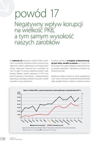 Na wykresie 22 zestawiono wielkość PKB w przeliczeniu na jednego mieszkańca (kolor czerwony) oraz odporność sektora publicznego na korupcję (kolor czarny). Odporność mierzona jest w punktach od 0 do 10, gdzie 10 oznacza całkowitą czystość i brak korupcji. Badanie zostało wykonane w 2013 roku przez Transparency International - międzynarodową organizacją zwalczającą praktyki korupcyjne przede wszystkim w życiu publicznym.