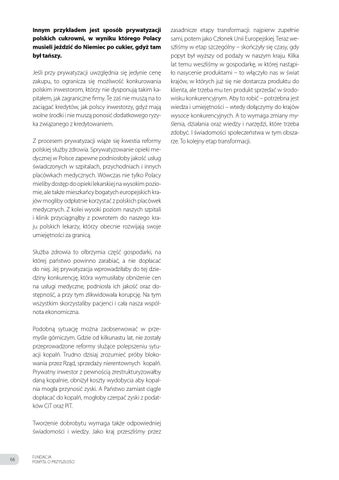 Innym przykładem jest sposób prywatyzacji polskich cukrowni, w wyniku którego Polacy musieli jeździć do Niemiec po cukier, gdyż tam był tańszy. Jeśli przy prywatyzacji uwzględnia się jedynie cenę zakupu, to ogranicza się możliwość konkurowania polskim inwestorom, którzy nie dysponują takim kapitałem, jak zagraniczne firmy. Te zaś nie muszą na to zaciągać kredytów, jak polscy inwestorzy, gdyż mają wolne środki i nie muszą ponosić dodatkowego ryzyka związanego z kredytowaniem. Z procesem prywatyzacji wiąże się kwestia reformy polskiej służby zdrowia. Sprywatyzowanie opieki medycznej w Polsce zapewne podniosłoby jakość usług świadczonych w szpitalach, przychodniach i innych placówkach medycznych. Wówczas nie tylko Polacy mieliby dostęp do opieki lekarskiej na wysokim poziomie, ale także mieszkańcy bogatych europejskich krajów mogliby odpłatnie korzystać z polskich placówek medycznych. Z kolei wysoki poziom naszych szpitali i klinik przyciągnąłby z powrotem do naszego kraju polskich lekarzy, którzy obecnie rozwijają swoje umiejętności za granicą. Służba zdrowia to olbrzymia część gospodarki, na której państwo powinno zarabiać, a nie dopłacać do niej. Jej prywatyzacja wprowadziłaby do tej dziedziny konkurencję, która wymusiłaby obniżenie cen na usługi medyczne, podniosła ich jakość oraz dostępność, a przy tym zlikwidowała korupcję. Na tym wszystkim skorzystaliby pacjenci i cała nasza wspólnota ekonomiczna. Podobną sytuację można zaobserwować w przemyśle górniczym. Gdzie od kilkunastu lat, nie zostały przeprowadzone reformy służące polepszeniu sytuacji kopalń. Trudno dzisiaj zrozumieć próby blokowania przez Rząd, sprzedaży nierentownych kopalń. Prywatny inwestor z pewnością zrestrukturyzowałby daną kopalnie, obniżył koszty wydobycia aby kopalnia mogła przynosić zyski. A Państwo zamiast ciągle dopłacać do kopalń, mogłoby czerpać zyski z podatków CiT oraz PiT. Tworzenie dobrobytu wymaga także odpowiedniej świadomości i wiedzy. Jako kraj przeszliśmy przez