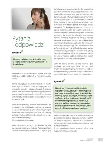 i chęć poznania nowych regionów. Do naszego kraju, w tym samym celu przyjeżdża znikoma ilość turystów. Polska też mogłaby przygotować ciekawą ofertą narciarską dla własnych i zagranicznych turystów, ale nie pozwalają na to polscy urzędnicy. Inwestor, który chciałby w kraju wybudować wyciągi i trasy narciarskie, musi zdobyć ponad 20 różnego rodzaju pozwoleń. Do każdego pozwolenia potrzebne są opinie ekspertów. Jeżeli do kosztów uzyskania pozwoleń i ekspertyz dodamy koszty opłat za zamianę przeznaczenia gruntu, to całkowity koszt przygotowania inwestycji może być nie mniejszy niż koszt zakupu krzesełkowego wyciągu narciarskiego. W innych krajach tego typu uciążliwości dla inwestorów nie istnieją. Uwzględniając fakt, że sezon narciarski w Polsce jest krótszy niż w Alpach, karnet na wyciągi w Polsce musi być droższy niż w Austrii. W tej sytuacji zagraniczni turyści raczej nie decydują się na narciarski urlop w Polsce, a budowa w Polsce stacji narciarskich jest obarczona ogromnym ryzykiem. Jeżeli my Polacy chcemy się dalej rozwijać i pod względem ekonomicznym zbliżać do zamożnych krajów Unii Europejskiej, musimy zmienić sposób postrzegania własnego państwa i podejść racjonalnie do gospodarki naszej polskiej wspólnoty ekonomicznej.