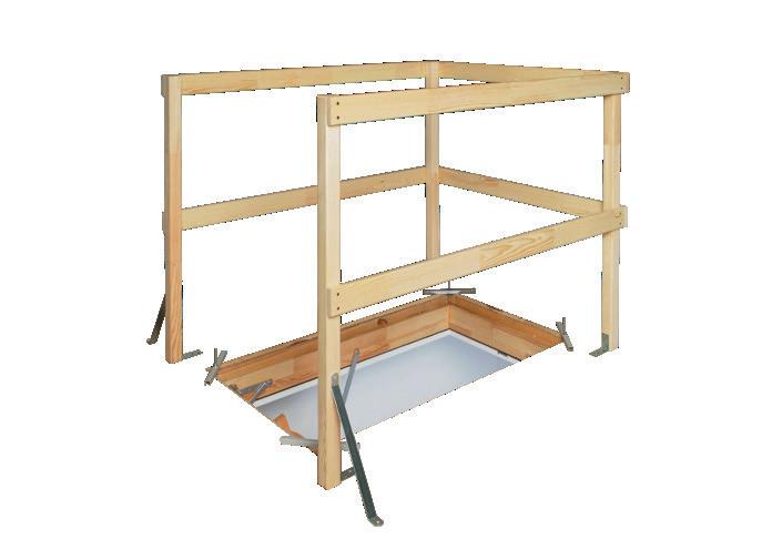 Beskyttelsesrækværk udført i fyrretræ, sikrer loftsåbningen fra loftsetagen, og gør det også nemmere at gå ned af trappen. Den monteres direkte i gulvet på loftet ved hjælp af kantbeslag til montage. Rækværkets størrelse er tilpasset den største størrelse lofttrapper – 86 x 140 cm, og det kan anvendes ved alle mindre trappestørrelser.