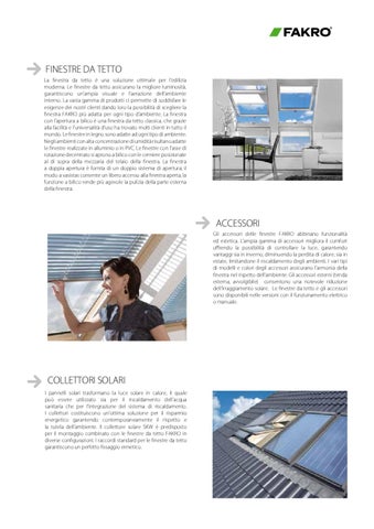 Gli accessori delle finestre FAKRO abbinano funzionalità ed estetica. L’ampia gamma di accessori migliora il comfort offrendo la possibilità di controllare la luce, garantendo vantaggi sia in inverno, diminuendo la perdita di calore, sia in estate, limitandone il riscaldamento degli ambienti. I vari tipi di modelli e colori degli accessori assicurano l’armonia della finestra nel rispetto dell’ambiente. Gli accessori esterni (tenda esterna, avvolgibile) consentono una notevole riduzione dell’irraggiamento solare. Le finestre da tetto e gli accessori sono disponibili nelle versioni con il funzionamento elettrico o manuale.