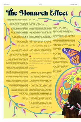 The Monarch Effect A tangerine-colored butterfly flits across a cerulean sky. It soars above the San Diego skyline, dipping around apartment buildings and weaving through lamp posts until it begins its descent into Barrio Logan. There, it finds a place like the home it once had — a chrysalis. But this chrysalis is not a cocoon of sticky silk. Instead, it is a chalk-white, one-story building, covered with vibrant paintings and intricate geometric designs. This is The Chrysalis, the Monarch School’s Center for the Arts — a creative haven for children with unstable homes. The Monarch School is a one-of-a-kind K-12 public school serving around 300 unhoused San Diego children. Two years ago, the Monarch School began a new venture — an arts center designed to elevate its students’ self-expression to new heights. When the Monarch School got a new CEO, Afira Devires, over the pandemic, she went around asking each department what their wishlist was. “ I was heading the arts department at the time so I asked the kids what they wanted,” Erika Malone, Director of Creative Youth Development at the Monarch School, said. “They were like, ‘we need a stage’ and we ended up with a whole new building.” Since there was no space to build a theater at the Monarch School, they found a vacant building two blocks away, previously a church and electronics shop. Over the course of the year, students, staff and community members renovated the building into a 6,000-square-foot center for the arts, complete with a 100seat theater, art gallery and two studios for music and dance respectively. Every aspect of the Chrysalis, from its design to its name, was dreamt up by Monarch school students. “We intentionally designed the Chrysalis with ownership in mind,” Malone said. “A lot of the students who attend our school struggle with the concept of home so we wanted them to feel like the Chrysalis was of their own making. We had the kids design the space as if they were designing their own room.” One does not have to enter the Chrysalis to feel its ethos. The facade of the Chrysalis displays a vibrant set of butterfly wings emerging from a central heart. The wings embrace the school as if they were a colorful shield. This is “El Corazón y su Mariposa,” (“The Heart and its Butterfly”), a 163-foot-wide mural that blossomed from the hearts and minds of Monarch students and local interdisciplinary artist Araceli Carrera. The piece not only reflects the students’ love and hope for the Chrysalis but their involvement in its creation. Once inside the main entrance, the Chrysalis opens into a multi-purpose performance space with a stage and seating. Here, the Monarch School students choreograph dance routines, music shows and plays, including a production of Peter Pan back in April of 2022. For many M o n a r c h stu d e nt s , showcasing their imagination a n d