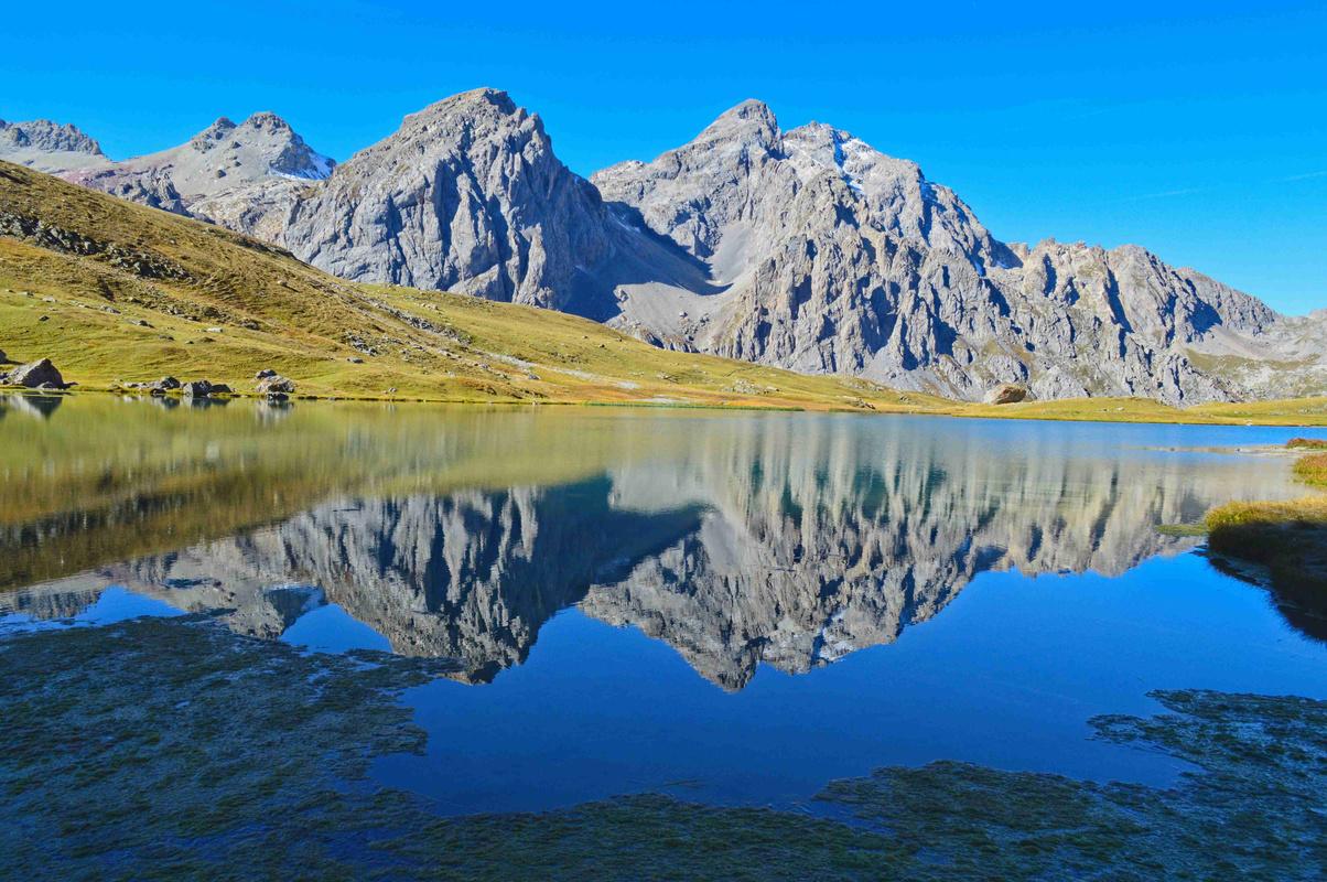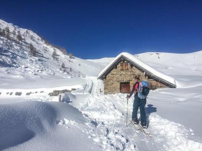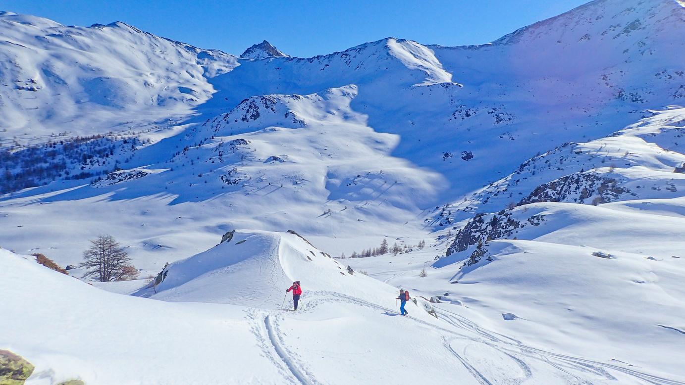 From the parking follow the path to the village of L’Alpe du Lauzet (sometimes you can only see the roofs of the buildings in winter). From there climb east up the steep slope. At the top of this head north into the Torrent du Rif valley