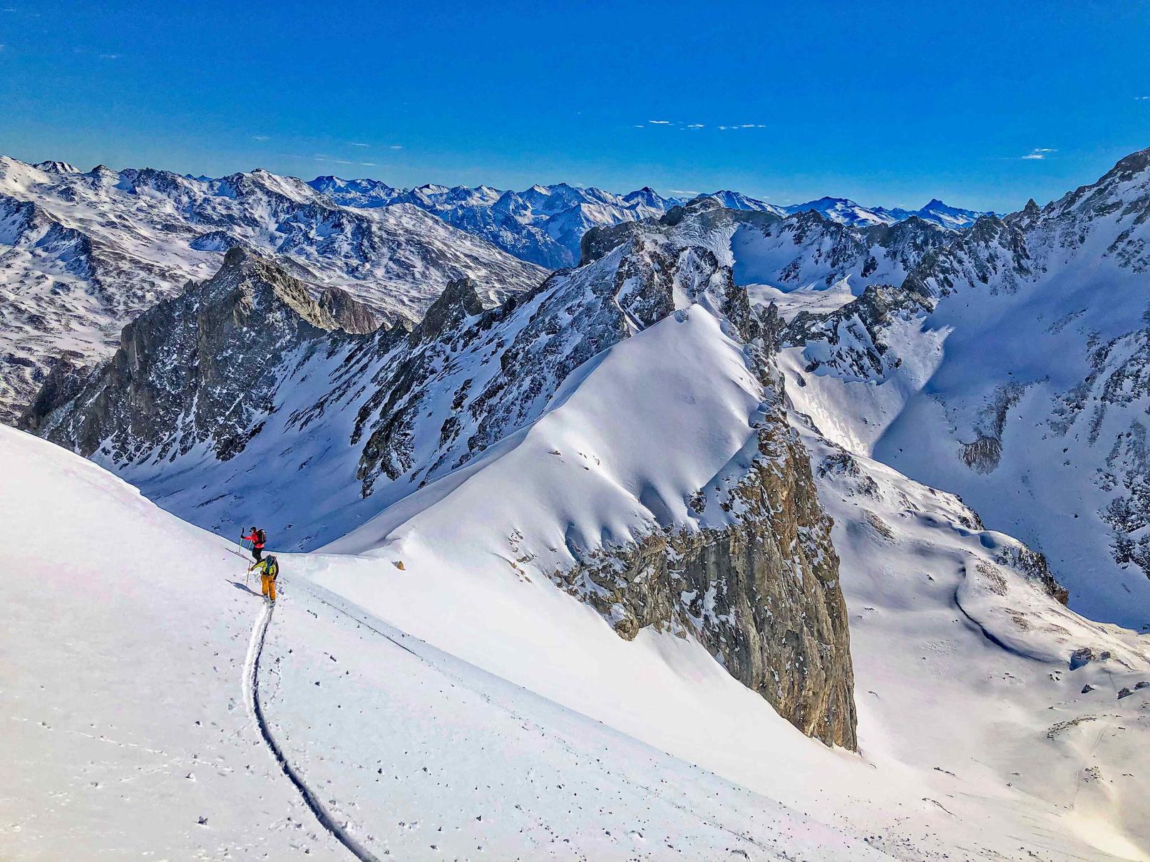 You can stay high on the right-hand slope or drop into the valley and skin up that. From the 2603m spot height make your way up and behind some rocks and into the couloir. From here climb to the top. Descend the couloir and then back in to the Rif valley Now comes the balancing act of getting back across the traverse without having to put skins back on. Then back down to the parking.