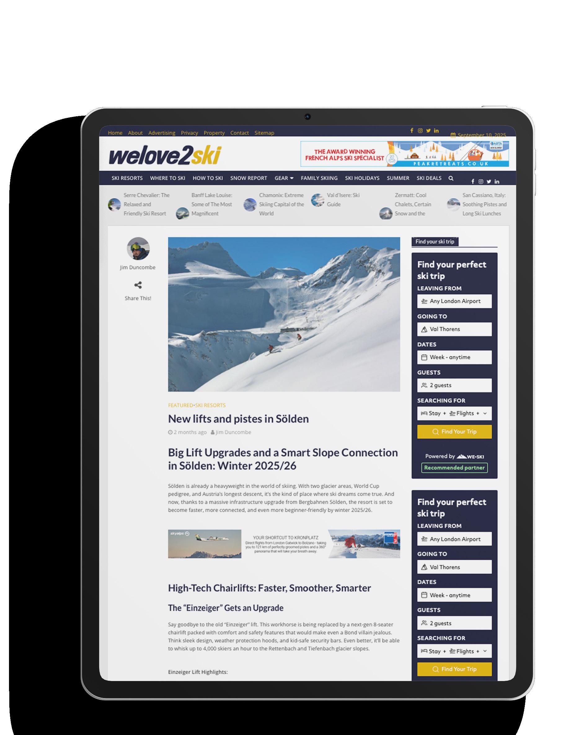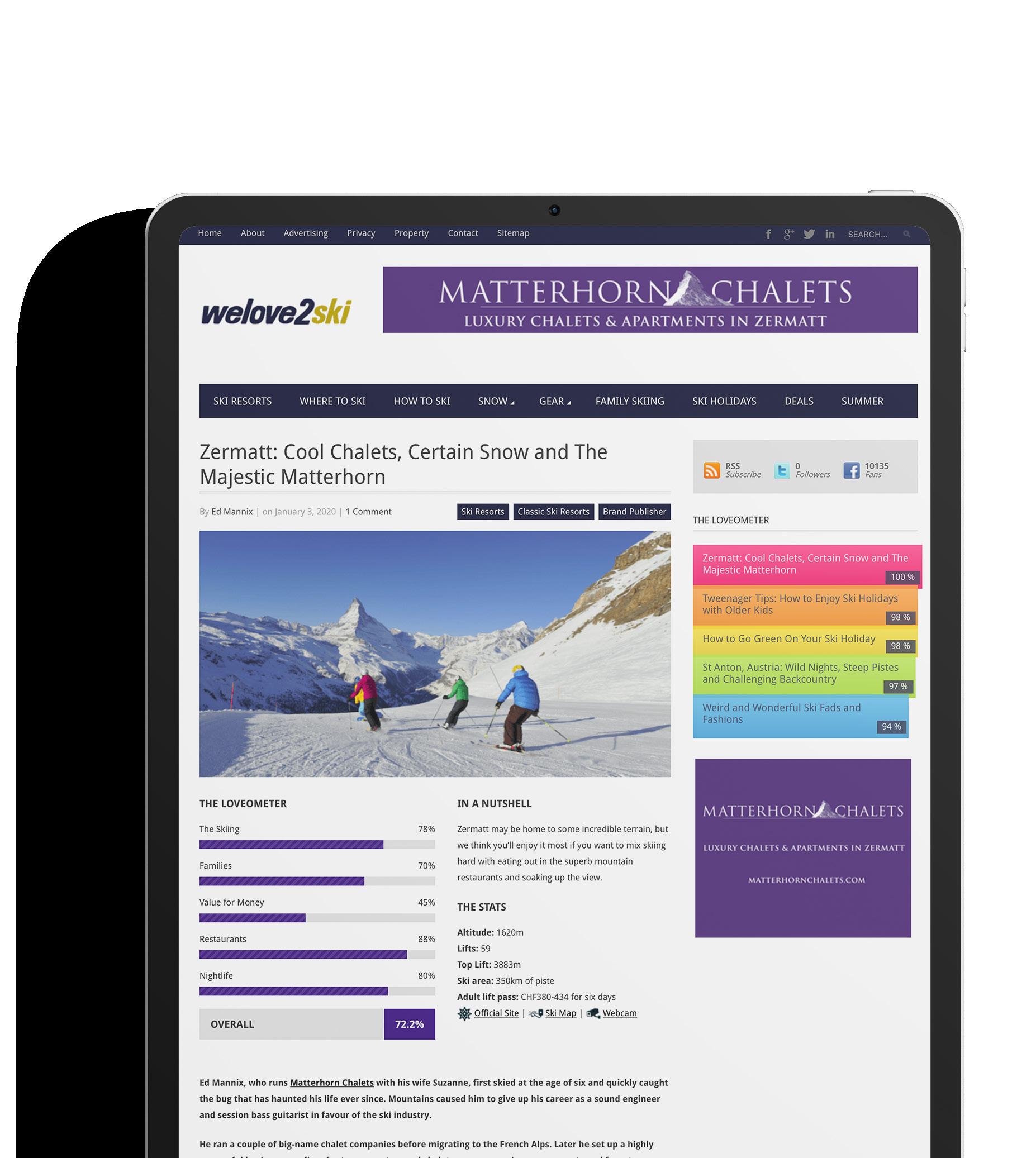 Welove2ski is where people come for inspiration on where to ski, how to travel, where to stay, what to buy, and how to improve their technique. They are hungry for information and expert advice, and Welove2ski is their one-shop portal for all they need to plan their ultimate ski trip.