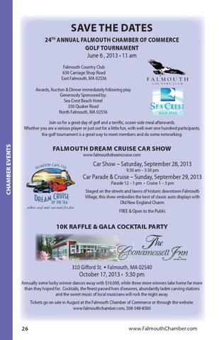 SAVE THE DATES 24TH ANNUAL FALMOUTH CHAMBER OF COMMERCE GOLF TOURNAMENT June 6 , 2013 • 11 am Falmouth Country Club 630 Carriage Shop Road East Falmouth, MA 02536 Awards, Auction & Dinner immediately following play Generously Sponsored by: Sea Crest Beach Hotel 350 Quaker Road North Falmouth, MA 02556