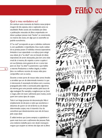 FALO CO Qual o meu verdadeiro eu? Em nenhum outro momento da história nossa própria imagem foi tão exposta, vista e explorada como na atualidade. Redes sociais são inundadas por fotos e publicações retocadas de filtros empenhados em deixar qualquer pessoa mais “bonita”, se convertendo, na maioria das vezes, em algo que se assemelha ao padrão eurocêntrico.
