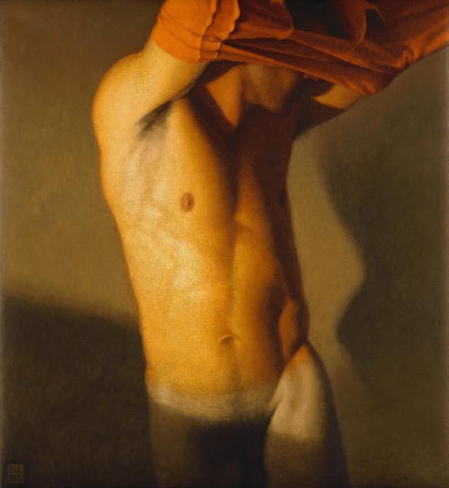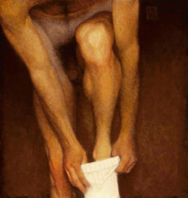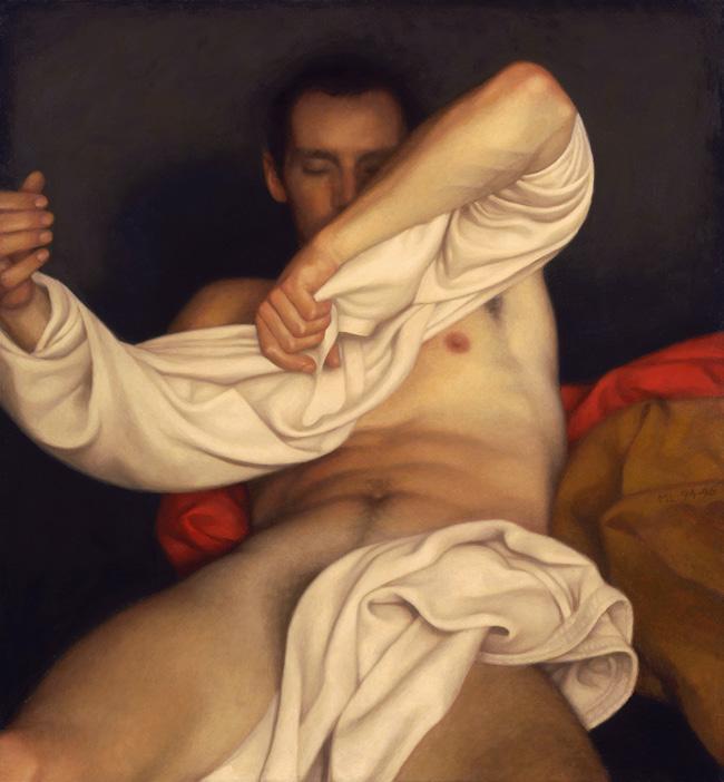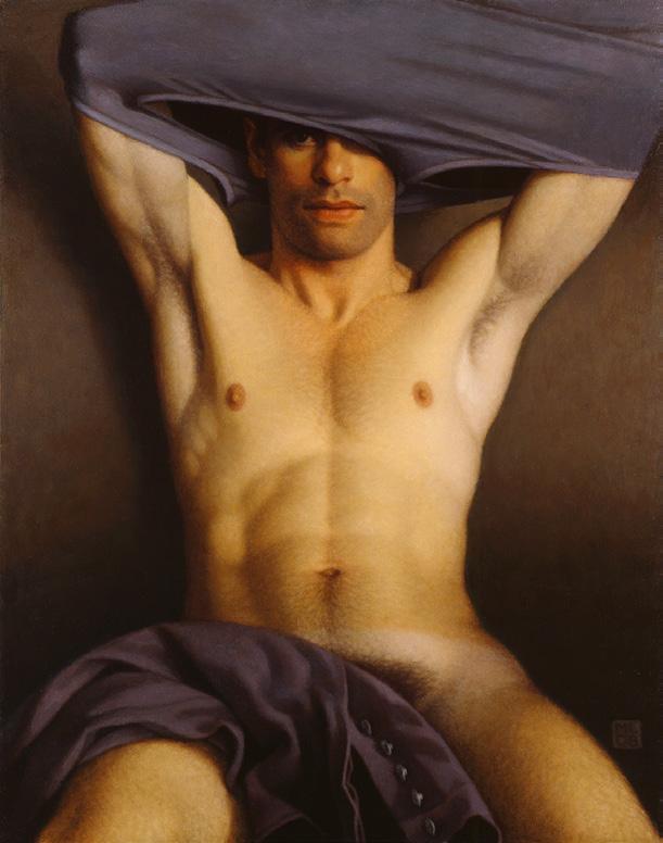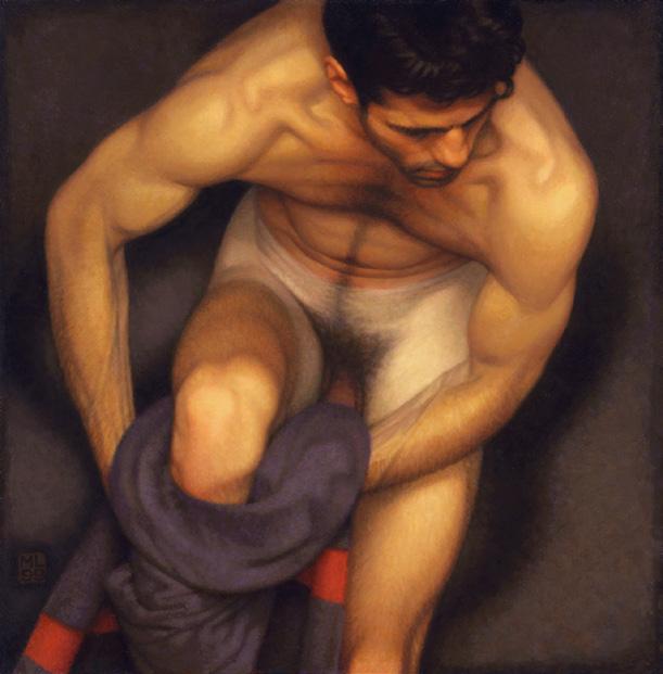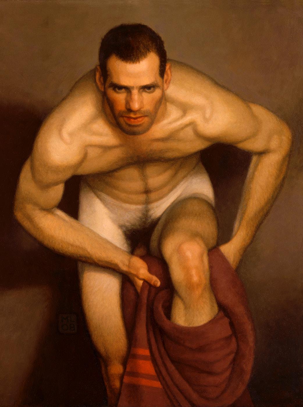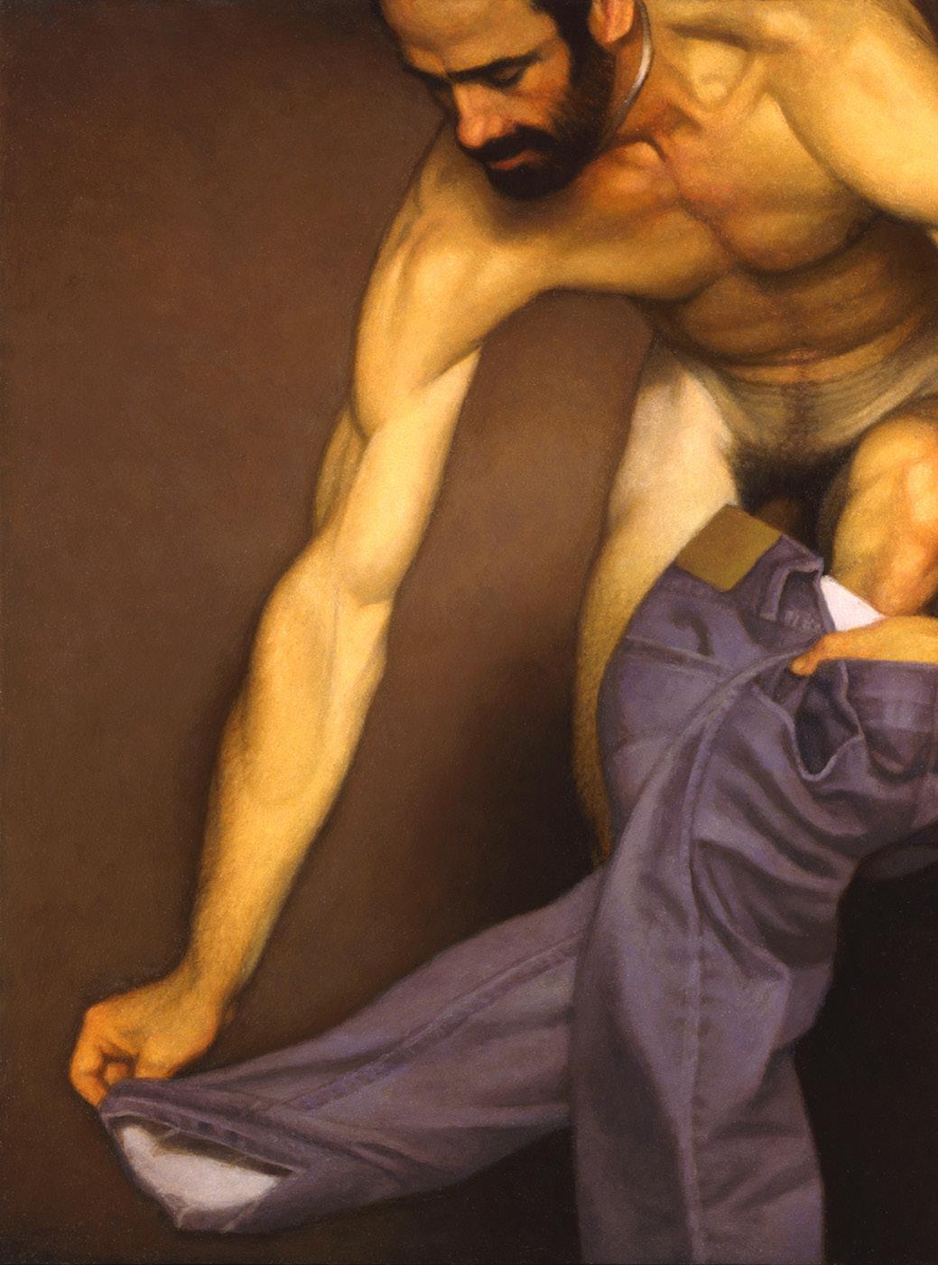 As ações comuns de cada dia apresentam um potencial pictórico infinito. Uma meia volta, uma mudança de equilíbrio, às vezes apenas uma intenção de movimento pode animar uma figura inteira. Isso aparece mais clara e dramaticamente na anatomia masculina. Sou fascinado pelas interações sutis de músculos, ossos e tendões que entram em jogo quando um corpo se move. Inconscientemente, um homem faz formas maravilhosas ao vestir uma camiseta, calçar uma calça ou se secar com uma toalha após o banho. Pedia aos modelos que se movimentassem em câmera lenta para me dar a chance de registrar algumas das formas maravilhosas que estavam fazendo. Essas formas geralmente sugerem a urgência do esporte ou a graça medida da dança e, de vez em quando, trazem à mente a postura de uma figura memorável de uma grande obra de arte. Admiro [Egon] Schiele (1890-1918) por seu poder erótico, perfeição gráfica e senso infalível de design. Com essas referências em mente, até mesmo a atividade mais rotineira adquire ressonância.