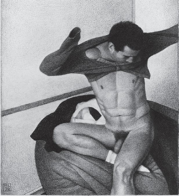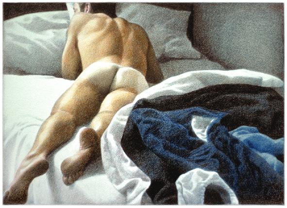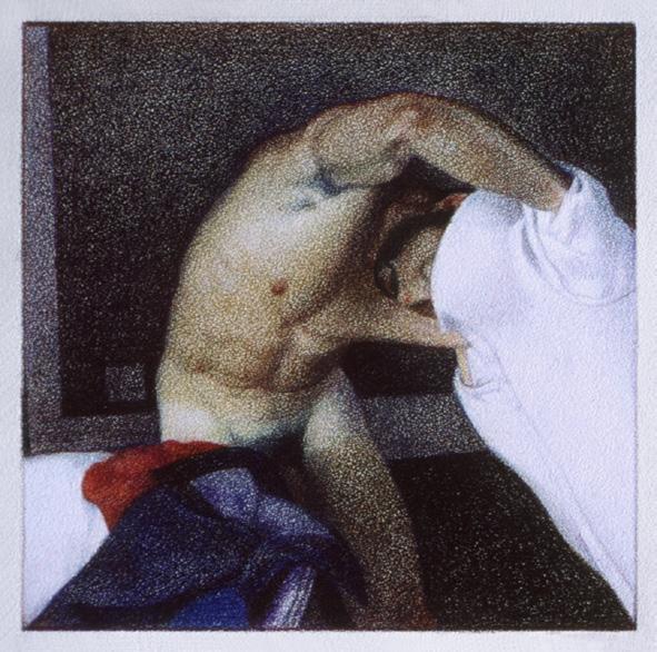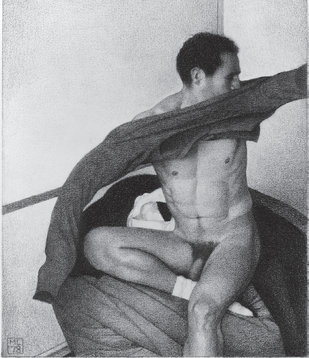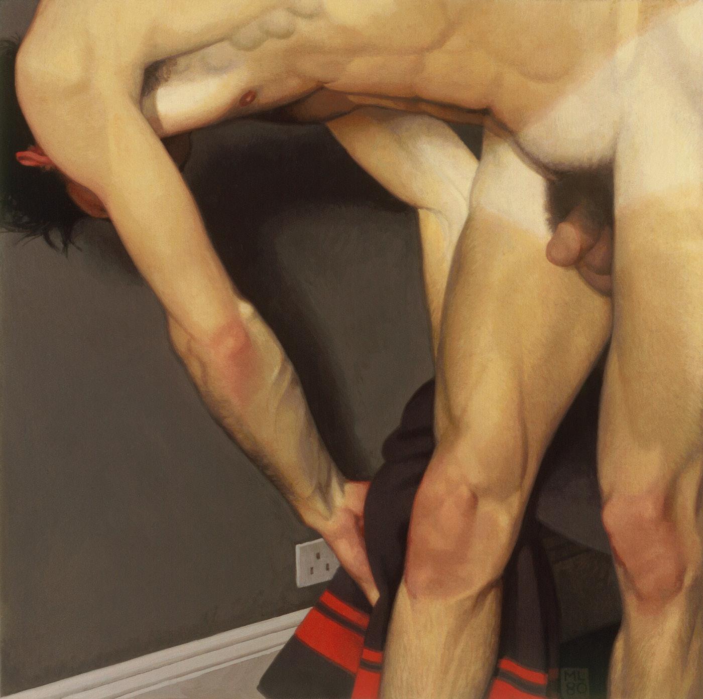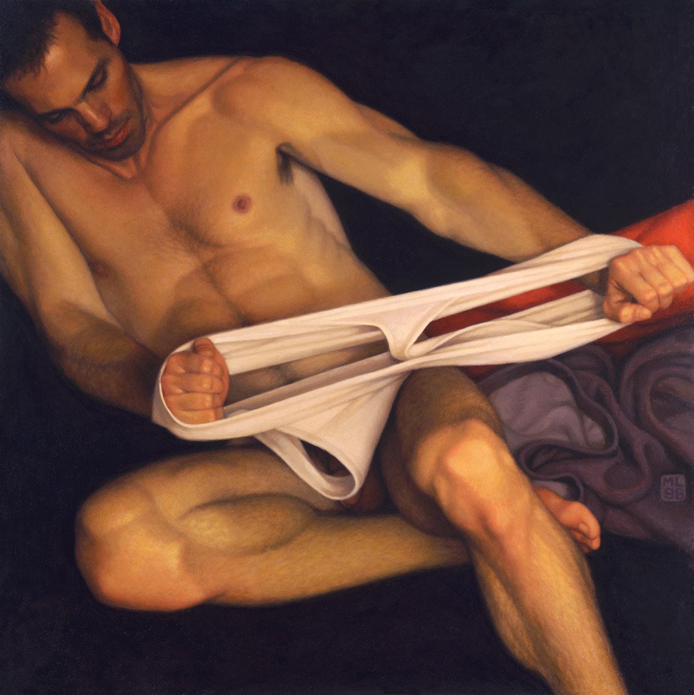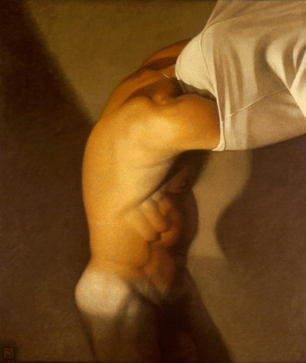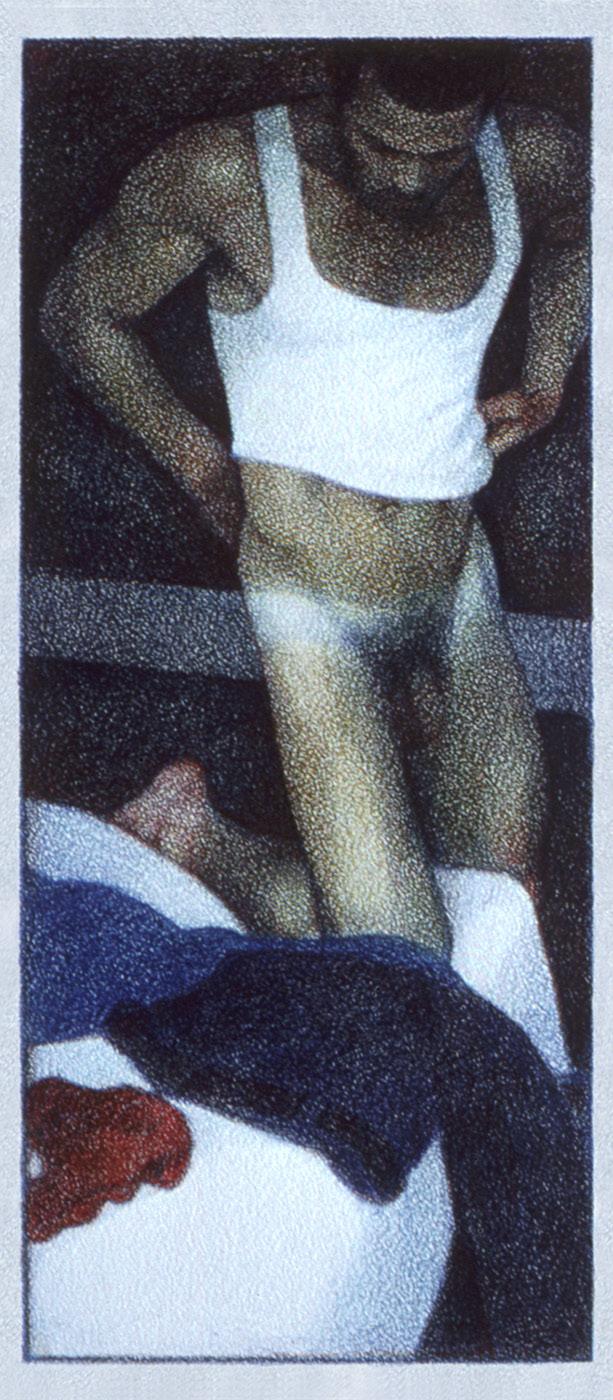 As ações comuns de cada dia apresentam um potencial pictórico infinito. Uma meia volta, uma mudança de equilíbrio, às vezes apenas uma intenção de movimento pode animar uma figura inteira. Isso aparece mais clara e dramaticamente na anatomia masculina. Sou fascinado pelas interações sutis de músculos, ossos e tendões que entram em jogo quando um corpo se move. Inconscientemente, um homem faz formas maravilhosas ao vestir uma camiseta, calçar uma calça ou se secar com uma toalha após o banho. Pedia aos modelos que se movimentassem em câmera lenta para me dar a chance de registrar algumas das formas maravilhosas que estavam fazendo. Essas formas geralmente sugerem a urgência do esporte ou a graça medida da dança e, de vez em quando, trazem à mente a postura de uma figura memorável de uma grande obra de arte. Admiro [Egon] Schiele (1890-1918) por seu poder erótico, perfeição gráfica e senso infalível de design. Com essas referências em mente, até mesmo a atividade mais rotineira adquire ressonância.
