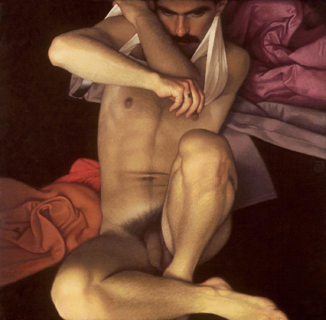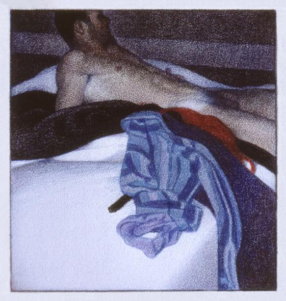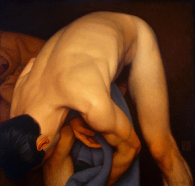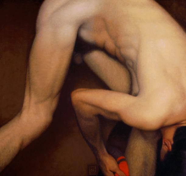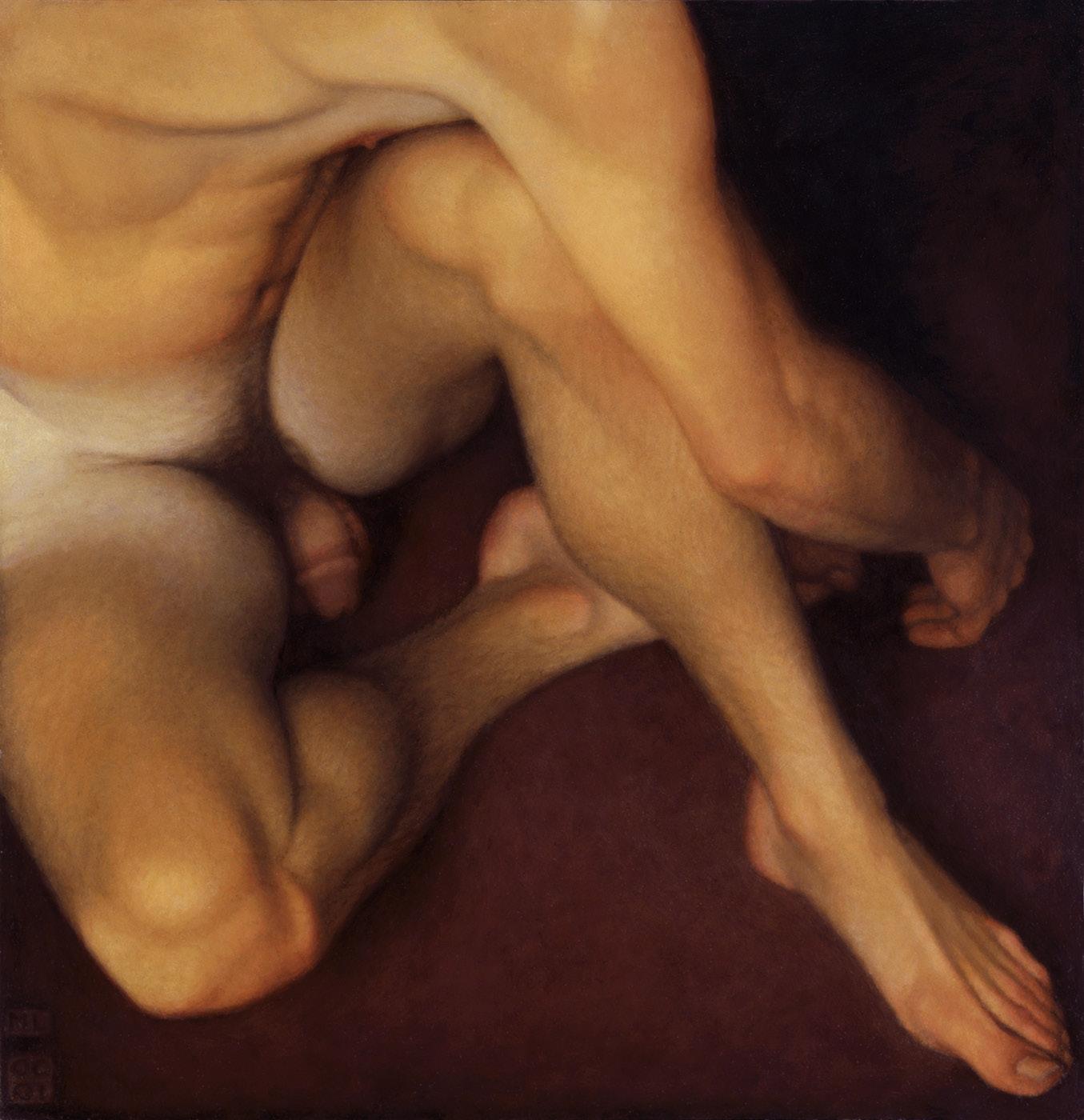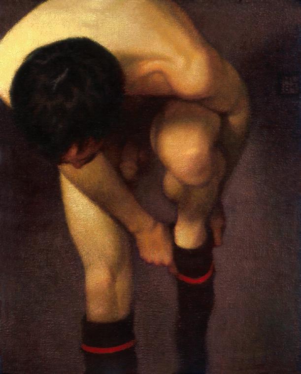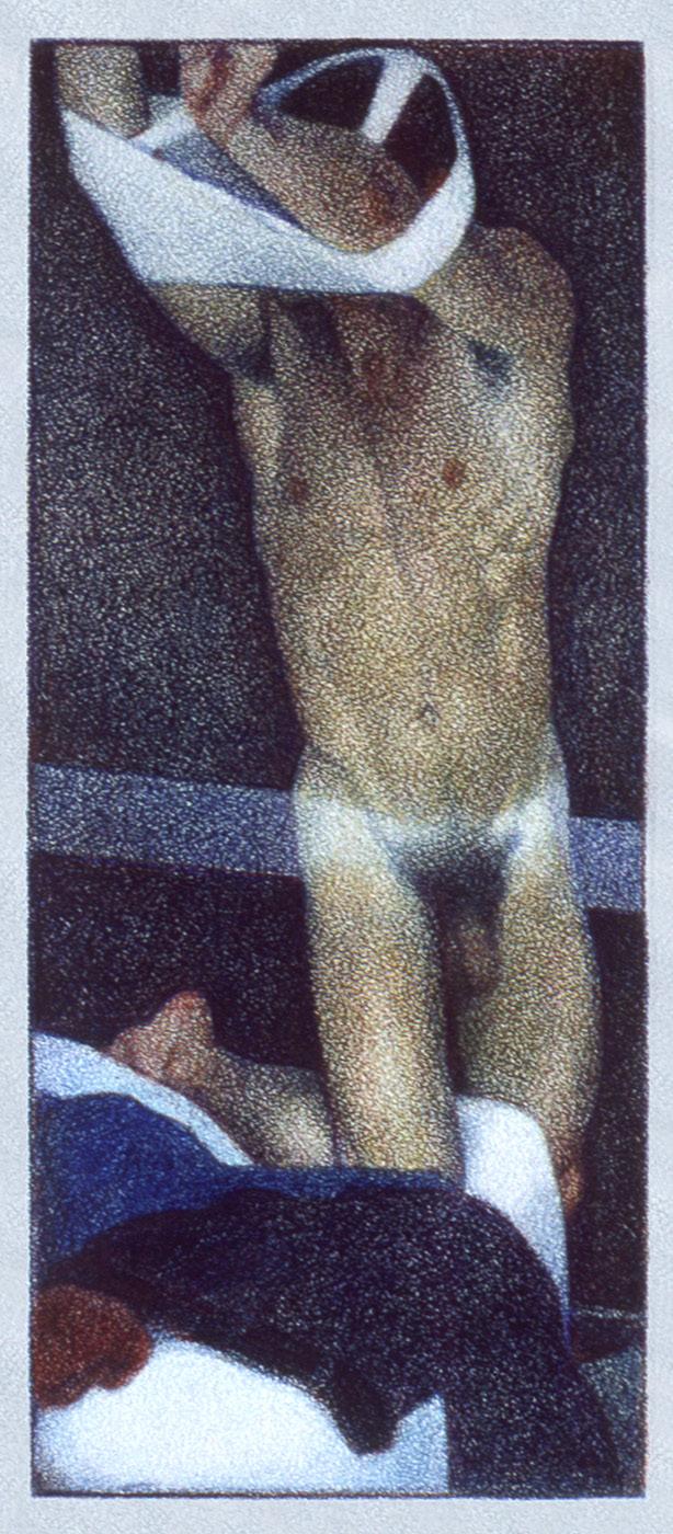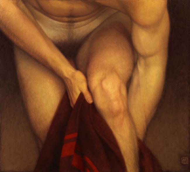 As ações comuns de cada dia apresentam um potencial pictórico infinito. Uma meia volta, uma mudança de equilíbrio, às vezes apenas uma intenção de movimento pode animar uma figura inteira. Isso aparece mais clara e dramaticamente na anatomia masculina. Sou fascinado pelas interações sutis de músculos, ossos e tendões que entram em jogo quando um corpo se move. Inconscientemente, um homem faz formas maravilhosas ao vestir uma camiseta, calçar uma calça ou se secar com uma toalha após o banho. Pedia aos modelos que se movimentassem em câmera lenta para me dar a chance de registrar algumas das formas maravilhosas que estavam fazendo. Essas formas geralmente sugerem a urgência do esporte ou a graça medida da dança e, de vez em quando, trazem à mente a postura de uma figura memorável de uma grande obra de arte. Admiro [Egon] Schiele (1890-1918) por seu poder erótico, perfeição gráfica e senso infalível de design. Com essas referências em mente, até mesmo a atividade mais rotineira adquire ressonância.