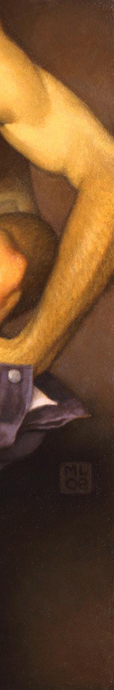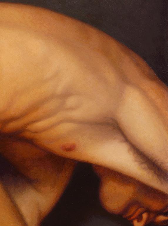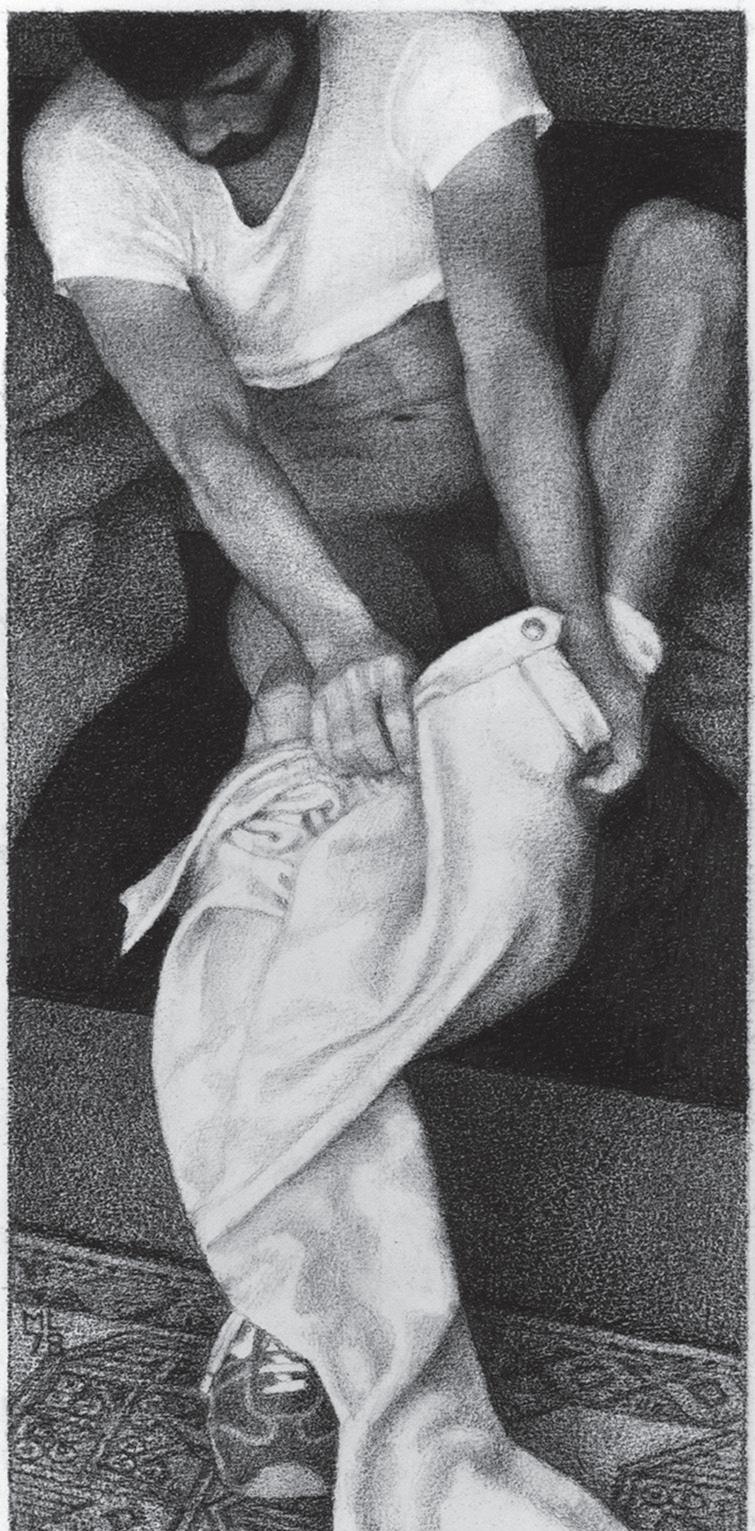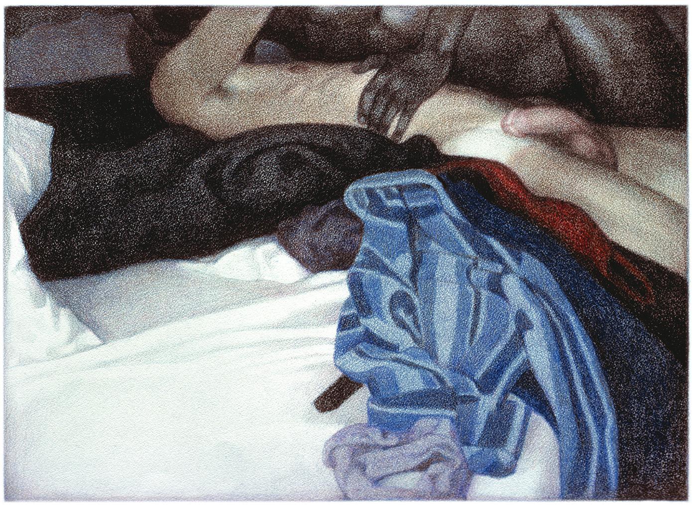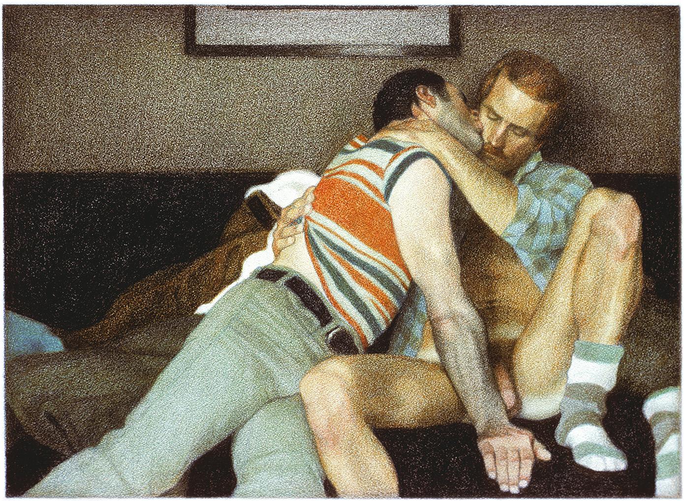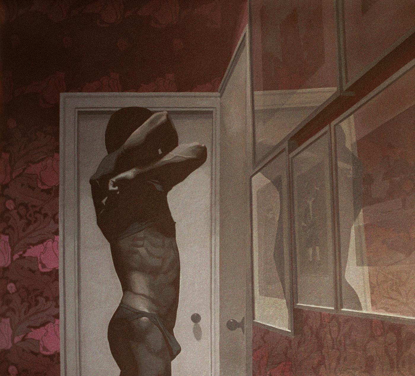 As ações comuns de cada dia apresentam um potencial pictórico infinito. Uma meia volta, uma mudança de equilíbrio, às vezes apenas uma intenção de movimento pode animar uma figura inteira. Isso aparece mais clara e dramaticamente na anatomia masculina. Sou fascinado pelas interações sutis de músculos, ossos e tendões que entram em jogo quando um corpo se move. Inconscientemente, um homem faz formas maravilhosas ao vestir uma camiseta, calçar uma calça ou se secar com uma toalha após o banho. Pedia aos modelos que se movimentassem em câmera lenta para me dar a chance de registrar algumas das formas maravilhosas que estavam fazendo. Essas formas geralmente sugerem a urgência do esporte ou a graça medida da dança e, de vez em quando, trazem à mente a postura de uma figura memorável de uma grande obra de arte. Admiro [Egon] Schiele (1890-1918) por seu poder erótico, perfeição gráfica e senso infalível de design. Com essas referências em mente, até mesmo a atividade mais rotineira adquire ressonância.