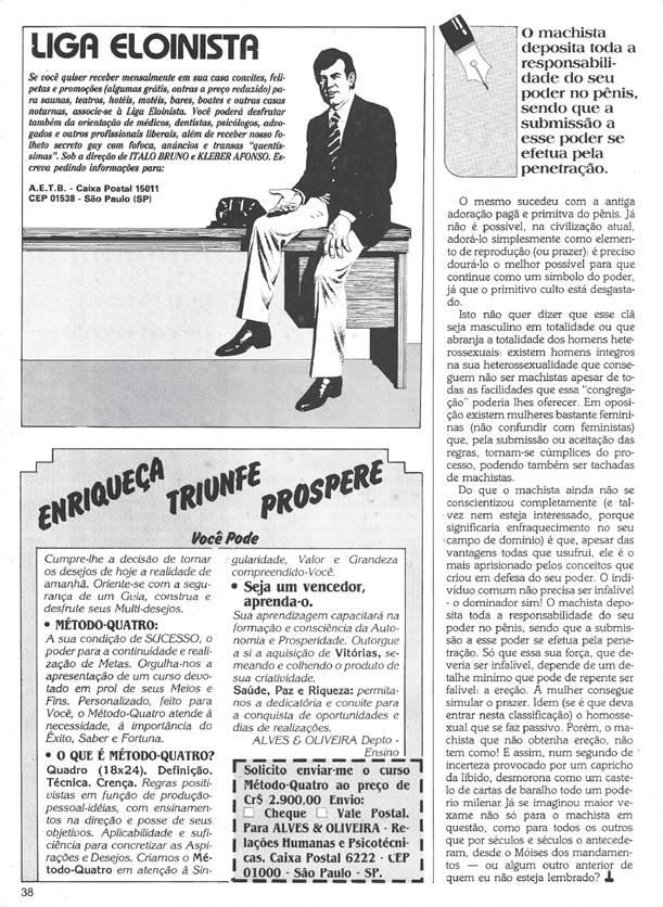 Esta carta pretende debater – finalmente – a homossexualidade em geral, o que sempre foi evitado em vossas páginas, e o travestismo no Brasil em particular, conforme reportagens dos dias 28 e 29 de março.