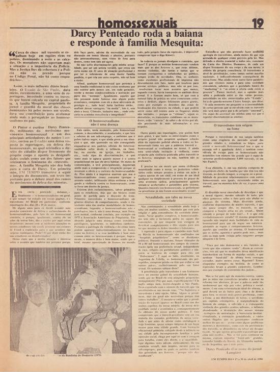 O pintor e escritor Darcy Penteado, militante do novíssimo movimento homossexual e um dos principais articuladores do nanico Lampião, enviou ao Estadão uma densa resposta às reportagens, em defesa dos homossexuais, na qual reivindica o direito do cidadão dispor livremente do próprio corpo e aponta as desigualdades sociais como um dos fatores que originaram o fenômeno do “travestismo”. A família Mesquita não deu bola para a carta do Darcy. Em primeira mão, EM TEMPO transcreve a seguir a íntegra do documento, um texto importante para o debate atual dos rumos do movimento de defesa das minorias.