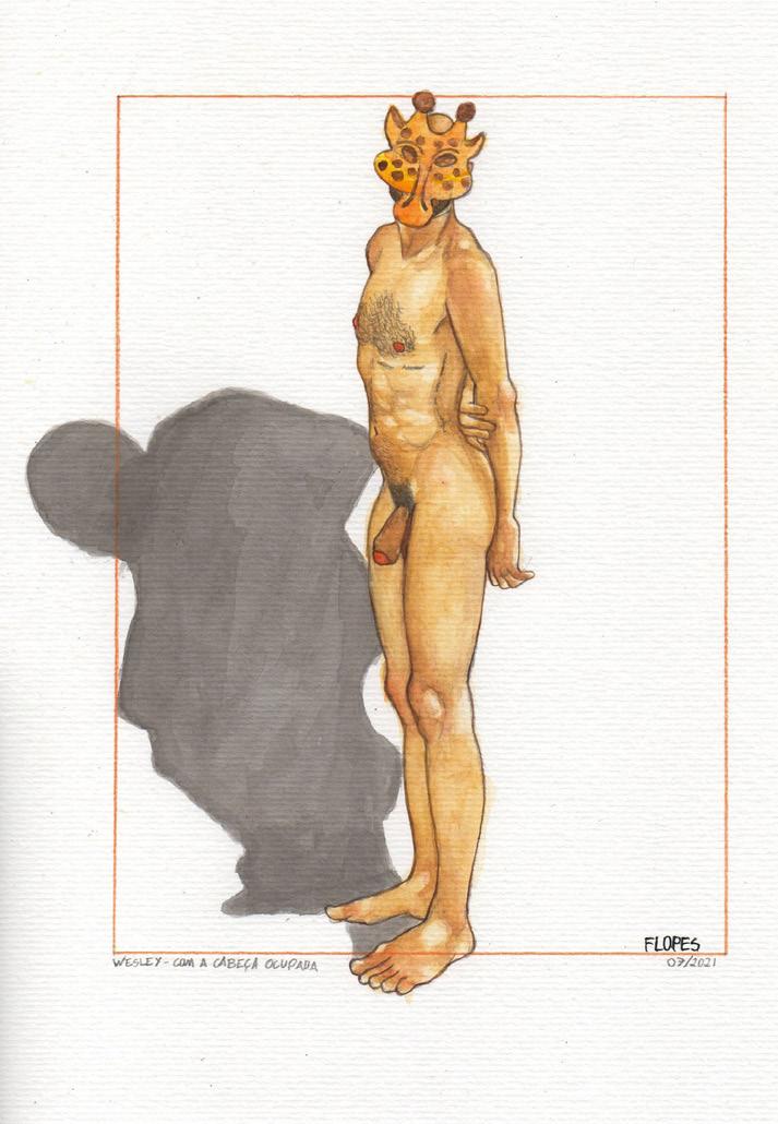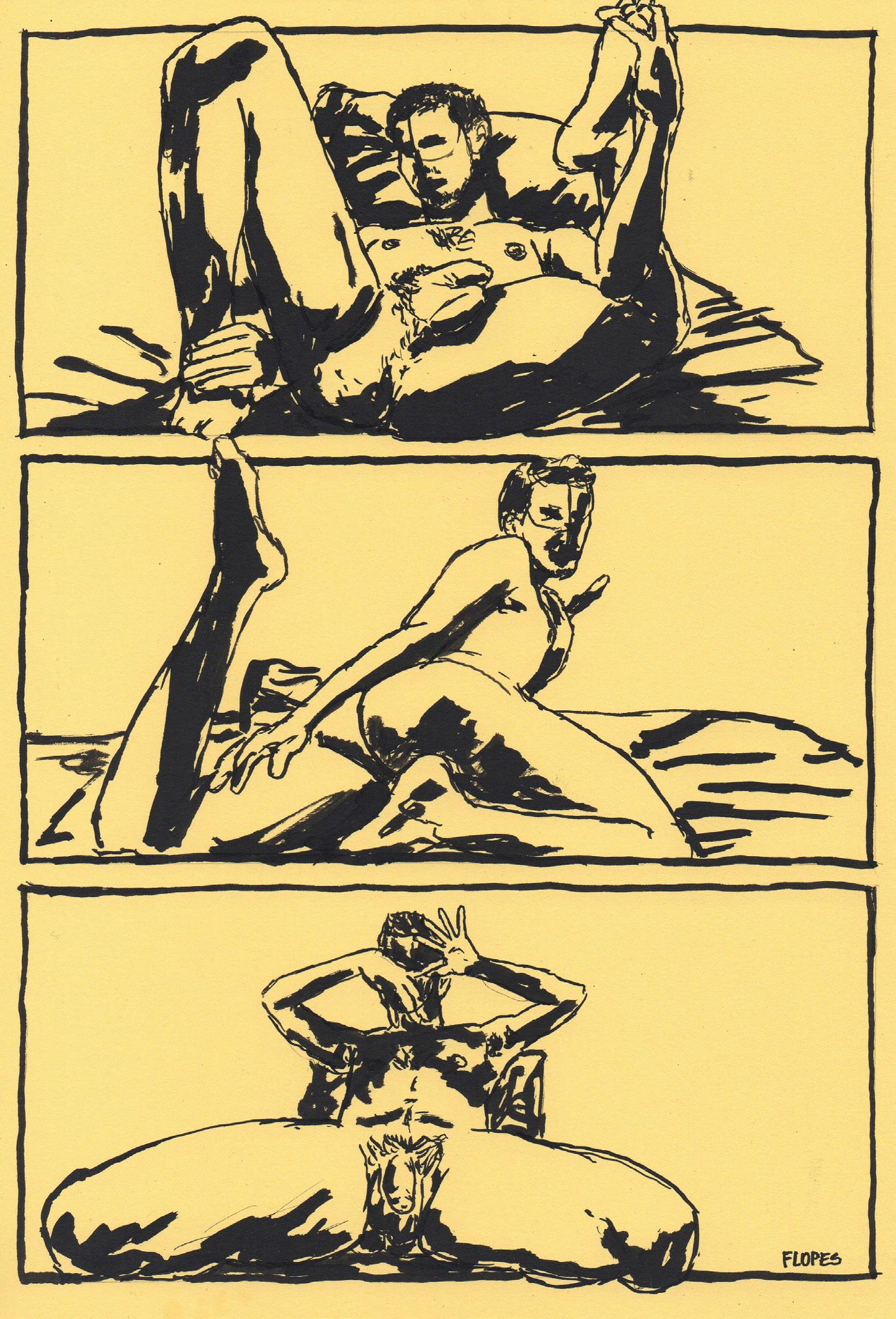As lembranças mais antigas de Flopes* são dele desenhando. De criança até um pouco depois de sua formação em Artes Visuais, sustentou a vontade de ser desenhista e se descobriu como artista, puxando influências do universo dos quadrinhos, como a estética erótica de Carlos Zéfiro (1921-1992), a anatomia e finalização impecável de Paolo Eleuteri Serpieri (1944-) na série Druuna, a forma de abordar o homoerotismo de Tom of Finland (1920-1991), as hachuras e arte finalização de Takehiko Inoue (1967-) no mangá Vagabond e a improvisação e o processo criativo de Lourenço Mutarelli (1964-), que ele teve o privilégio de ser aluno.