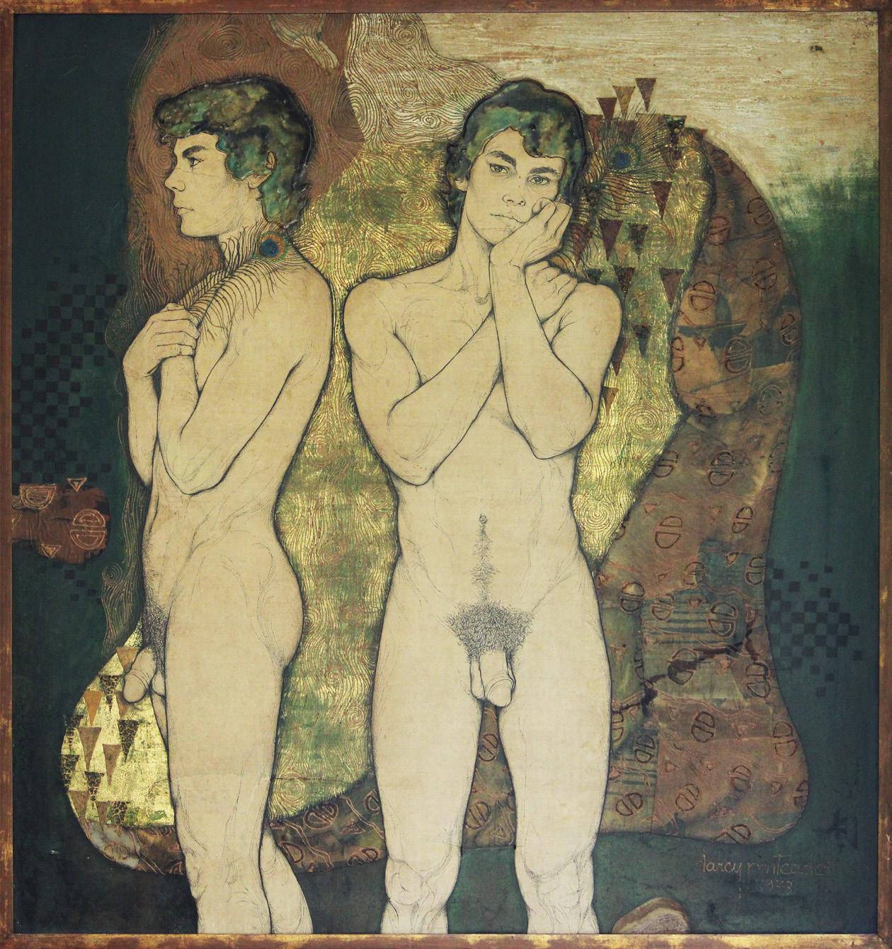 Nu masculino, colagem com esmalte e anilina, óleo, pastel e acrílica, 1973. (Acervo Darcy Penteado, Fundação Enrico Dell’Acqua)