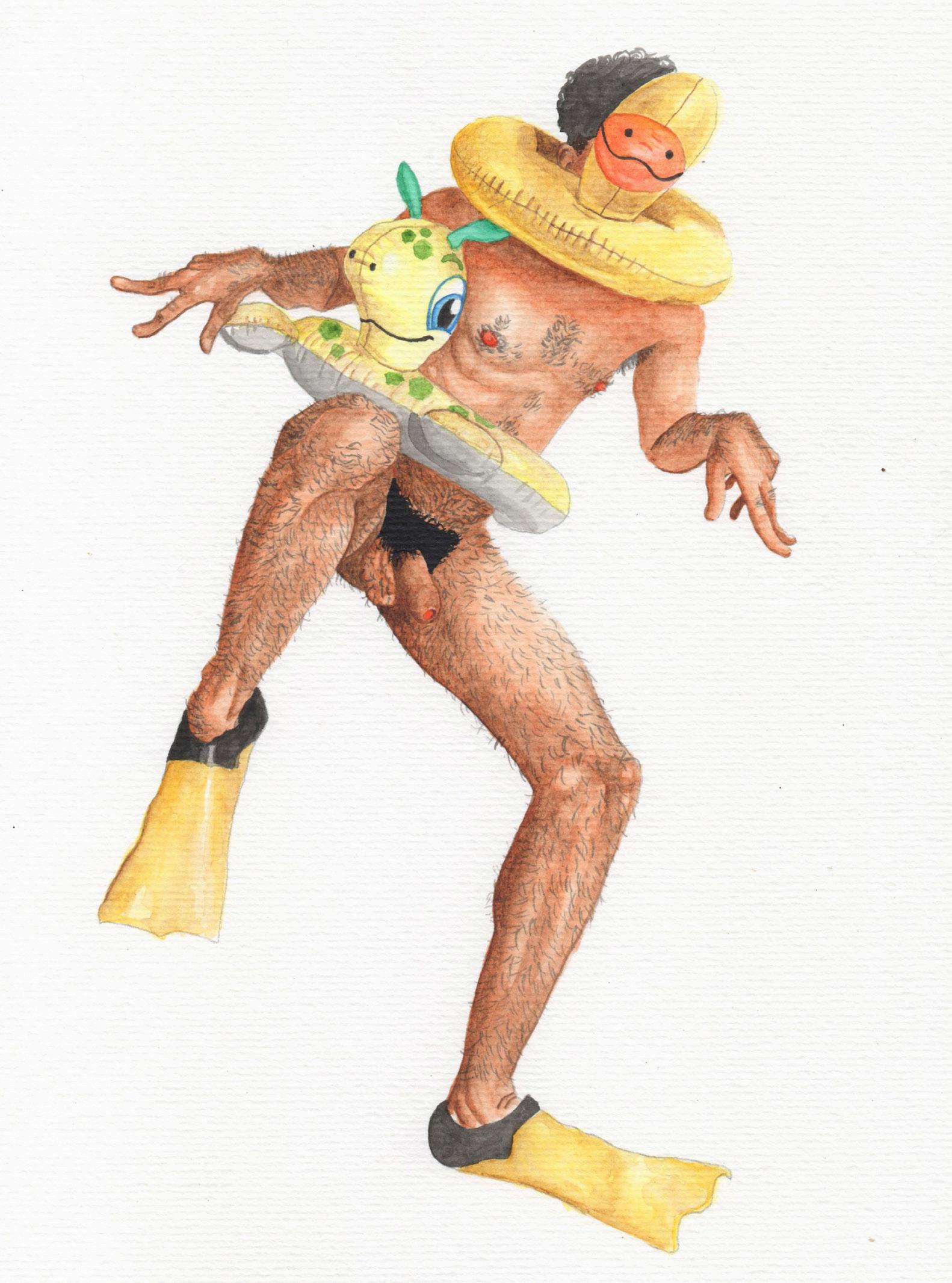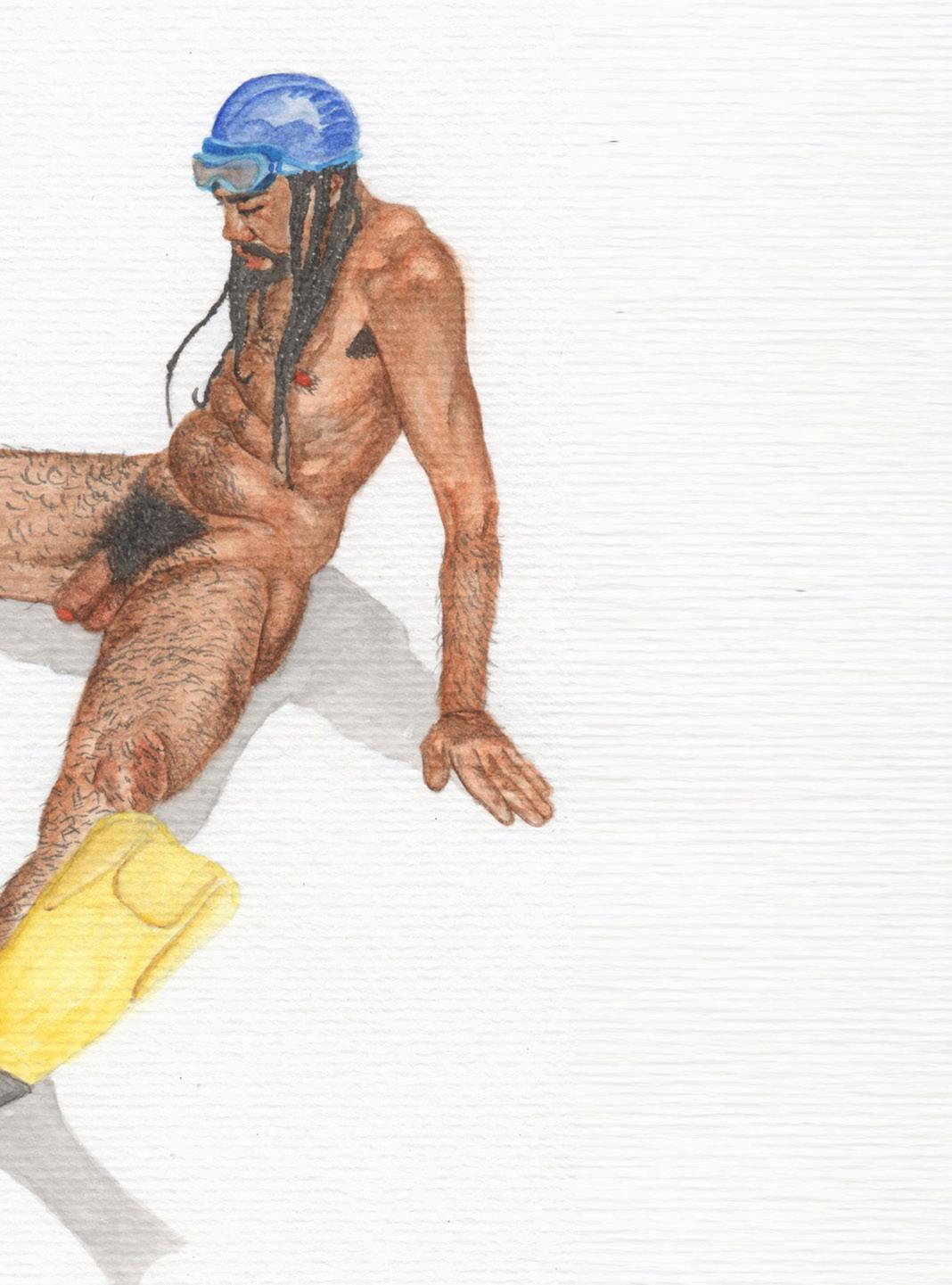 Banhista 2 (Autorretrato), da série Salva-Vidas, grafite, nanquim e aquarela sobre papel, 2024.
