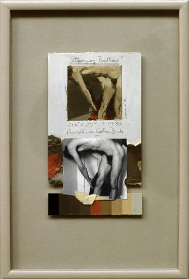 Acima, Banhista curvado, acrílica sobre algodão, 1980. Ao lado, estudo em grafite e colagem em técnica mista com foto original e paleta de cores.