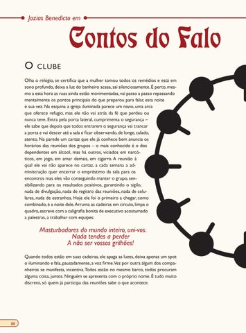 Olha o relógio, se certifica que a mulher tomou todos os remédios e está em sono profundo, deixa a luz do banheiro acesa, sai silenciosamente. É perto, mesmo a esta hora as ruas ainda estão movimentadas, vai passo a passo repassando mentalmente os pontos principais do que preparou para falar, esta noite é sua vez. Na esquina a igreja iluminada parece um navio, uma arca que oferece refugio, mas ele não vai atrás da fé que perdeu ou nunca teve. Entra pela porta lateral, cumprimenta o segurança –ele sabe que depois que todos entrarem o segurança vai trancar a porta e vai descer até a sala e ficar observando, de longe, calado, atento. Na parede um cartaz que ele já conhece bem anuncia os horários das reuniões dos grupos – o mais conhecido é o dos dependentes em álcool, mas há outros, viciados em narcóticos, em jogo, em amar demais, em cigarro. A reunião à qual ele vai não aparece no cartaz, a cada semana a administração quer encerrar o empréstimo da sala para os encontros mas eles vão conseguindo manter o grupo, sensibilizando para os resultados positivos, garantindo o sigilo, nada de divulgação, nada de registro das reuniões, nada de celulares, nada de estranhos. Hoje ele foi o primeiro a chegar, como combinado, é a noite dele. Arruma as cadeiras em círculo, limpa o quadro, escreve com a caligrafia bonita de executivo acostumado a palestras, a trabalhar com equipes: