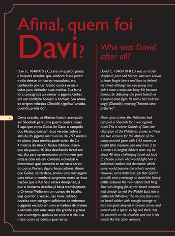 Davi (c. 1040-970 a.C.) era um pastor, poeta e harpista israelita, que, embora fosse jovem e não tivesse um corpo musculoso, era conhecido por ter lutado contra ursos e leões para defender suas ovelhas. Sua fama fora consagrada ao vencer o gigante Golias em um combate homem a homem. Seu nome de origem hebraica (Dawidh) significa “amado, querido, preferido”.