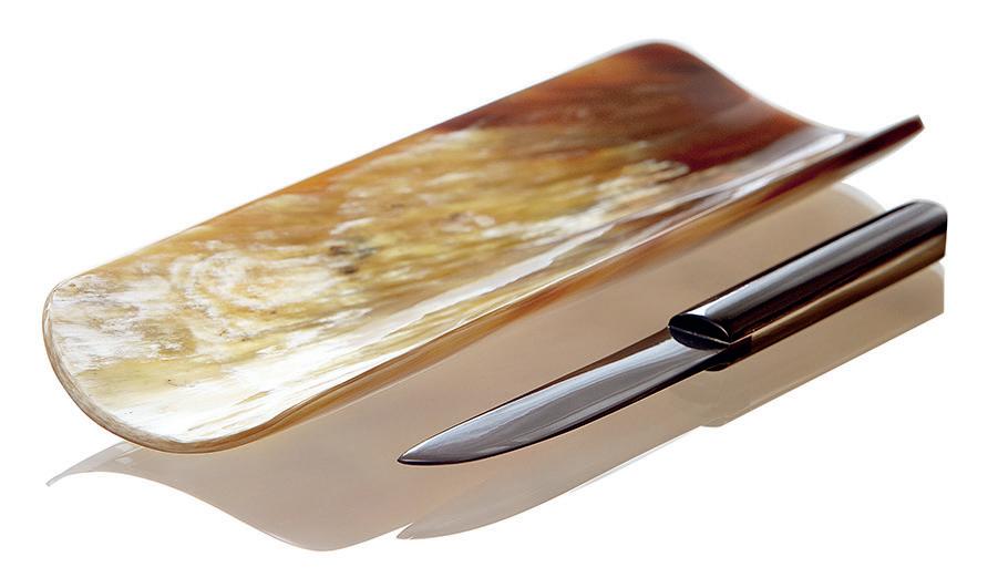 Für Freund:innen der gehobenen Schreibkultur hat die Hornmanufaktur Petz genau das Richtige: diese handgemachten Unikate für den Schreibtisch (Setpreis: € 153,–). Die Federrinne sorgt für Ordnung in Homeoffi ce oder Büro und eine übersichtliche Au ewahrung für Sti e & Co, das Briefmesser liegt dank verstärktem Griff gut in der Hand.