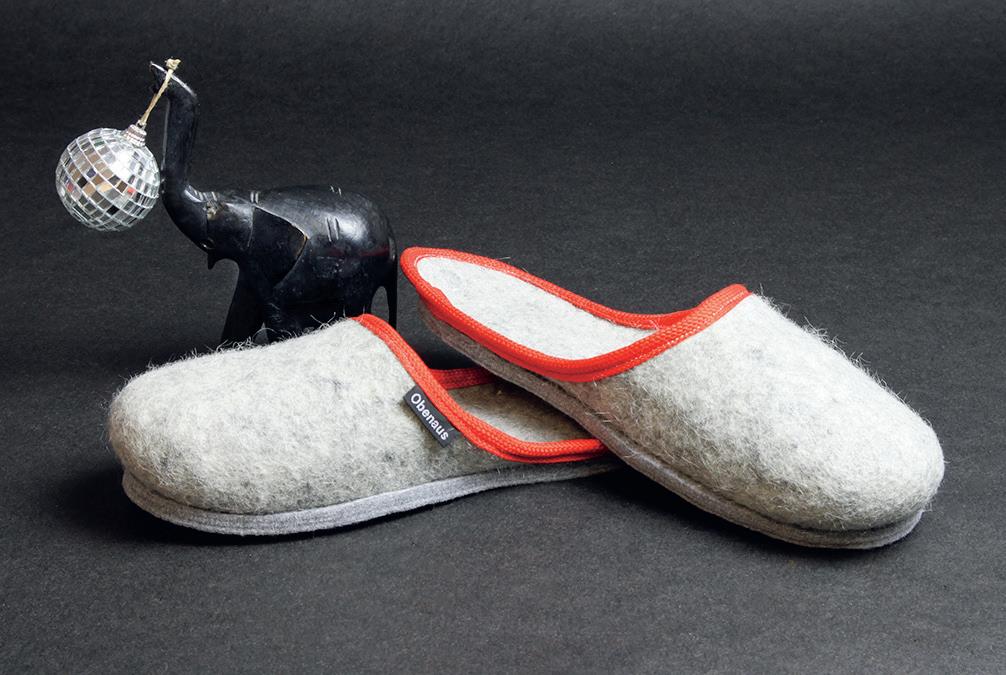 Für immer nie kalte Füße! Seit mehr als hundert Jahren werden die Pantoff eln aus der Obenaus Filzwerksta aus reiner österreichischer Schafwolle in Handarbeit hergestellt; sie sind nicht nur wohlig warm, sondern auch herrlich bequem. Wir verlosen zwei Paar (je € 46,–) in der Wunschgröße und mit adre er Borte in Wunschfarbe.