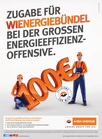 Die große Energieeffizienzoffensive wird verlängert – jetzt bis Ende Dezember bares Geld zurückholen. • beim Kauf energieeffizienter Geräte • bei Inanspruchnahme von Energieeffizienz-Dienstleistungen • bis zu 100 Euro* direkt aufs Bankkonto * Im Rahmen dieser Energieeffizienz-Offensive können pro Kunde maximal 100 Euro Förderbeitrag bei Kauf von energieeffizienten Geräten (pro Elektrogerät 50 Euro) in Anspruch genommen werden. Der Fördertopf steht Wien Energie Vertrieb-Kunden seit 1. Oktober 2013 bis zur Ausschöpfung, jedoch längstens bis 31. Dezember 2014, zur Verfügung. Die Gutscheine sind bei den teilnehmenden Partnern erhältlich.
