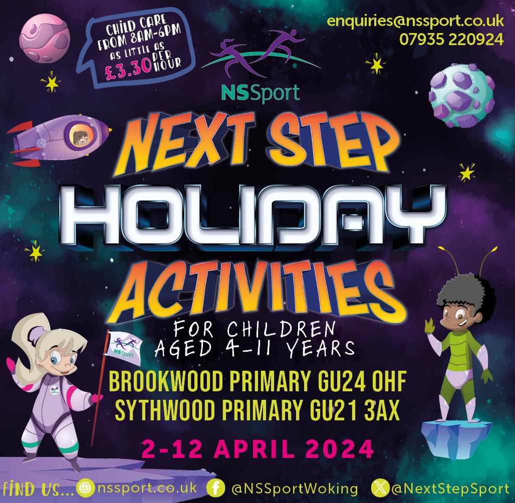 NSSport Holiday Activities is the perfect place for your children to have fun! They provide active, affordable, and exciting childcare during the holidays for children aged 4-11. Their two programmes, NS Stars and NS Strikers, will see your child enjoy their time away from school. Their unique programmes, led by a dedicated, enthusiastic, and highly qualified team, ensure your child can maintain their development and learning through play in a safe and appropriate environment. They are running Holiday Activities at Brookwood Primary School (GU24 0HF) and Sythwood Primary School (GU21 3AX) over the Easter holidays 2-12 April from 8am-6pm. For further information and bookings please visit www.nssport.co.uk or email enquiries@nssport.co.uk.
