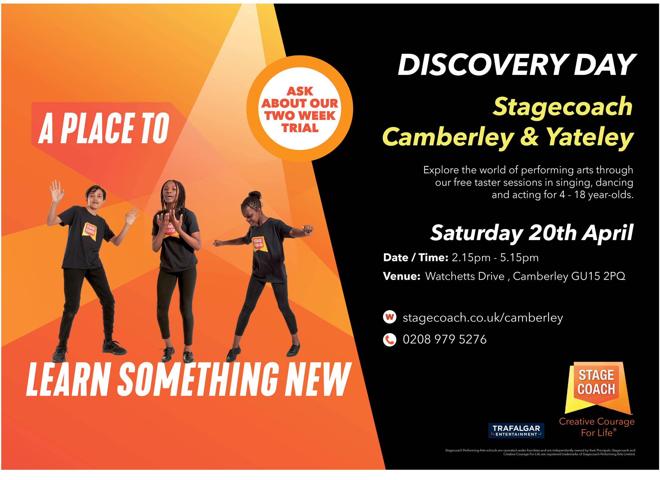 Stagecoach Camberley and Yateley are thrilled to announce the launch of an exciting Saturday afternoon class starting on April 20th. This innovative program caters to aspiring performers aged 6-17, offering a unique blend of acting, singing, dancing and confidence building. Performers are split into age related groups. To celebrate, a complimentary, FREE DISCOVERY DAY is scheduled from 2.15pm - 5.15pm at King’s College International School in Camberley on Saturday 20th April. Participants can immerse themselves in the dynamic world of performing arts and, if inspired, sign up for the term. As an added bonus, those who enroll will receive a free T-shirt, making the learning experience even more memorable. Don’t miss this opportunity to unleash your creative potential and build your CREATIVE COURAGE! To book your place on the discovery day, please email camberley@stagecoach.co.uk or book online at www.stagecoach.co.uk/camberley.