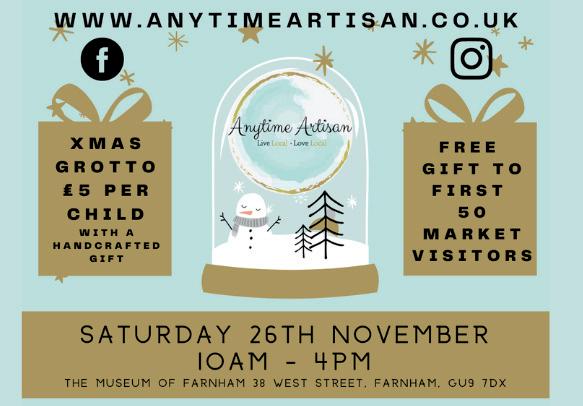 Christmas Grotto with handcrafted gift, £5 per child (tickets from anytimeartisan@gmail.com). 10am-4pm. LIVE LOCAL LOVE LOCAL Visit their virtual stalls at www.anytimeartisan.co.uk Facebook and Instagram - @anytimeartisan