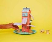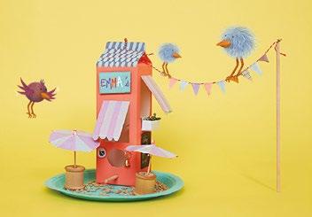 Nearly ready! Grown-ups, make a little ‘X’ with the Stanley knife below the seed hole and push a piece of dowel or a cocktail stick through. Finally, pop some tables and parasols outside for your first customers. Bobbins and mini umbrellas are perfect for this, or you could use corks and leaves if you want more plants.