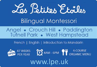 Les Petites Etoiles – Boys and girls, up to 5. Multi-lingual nurseries in Angel (formerly Mars Montessori) Crouch Hill, Tufnell Park, West Hampstead, and Paddington (formerly Les Trois Oursons). Angel open day May 11. Must book, Girls and boys. Intakes in Sept, Jan & May. See website to book a tour. 020 7099 0452 www.lpe.com