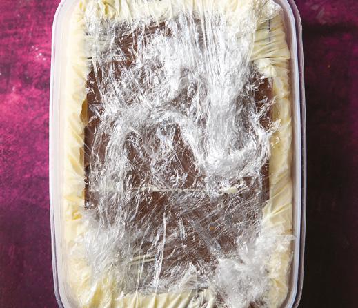 Arrange a layer of KitKats along the bottom of the container, face down (this will be the top when you turn the cake out)