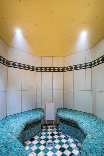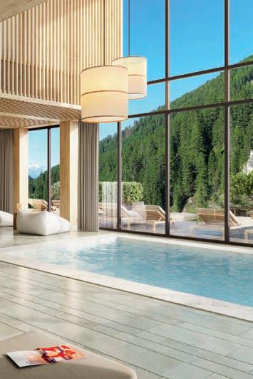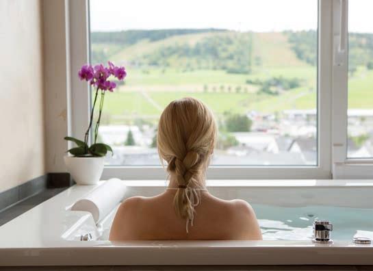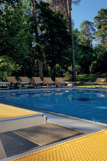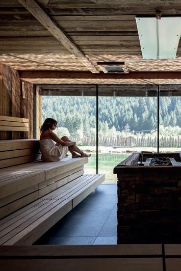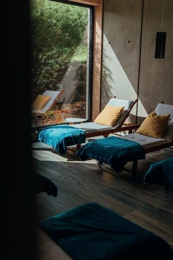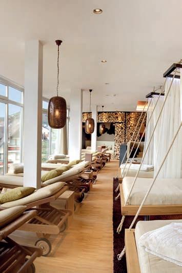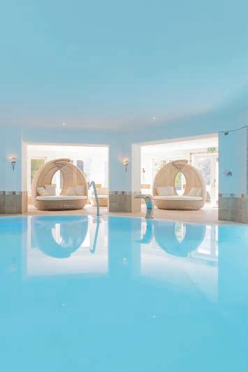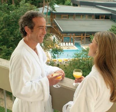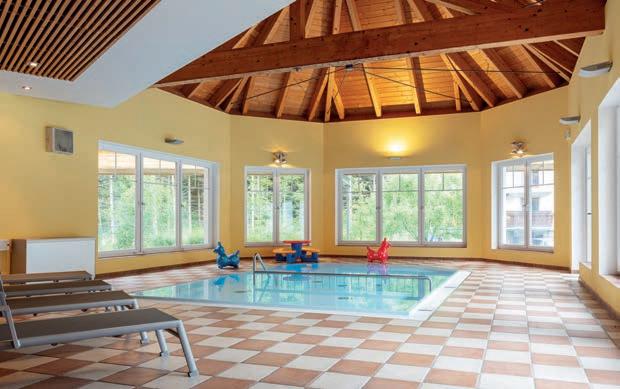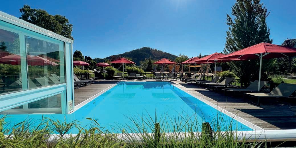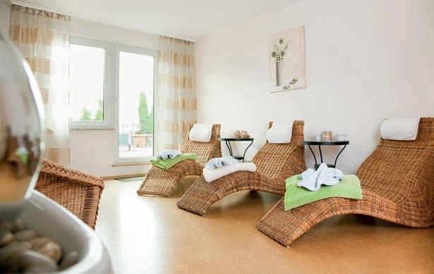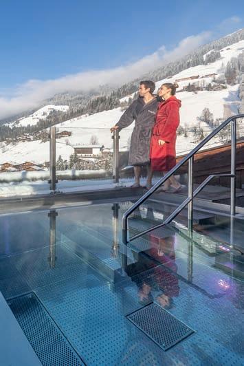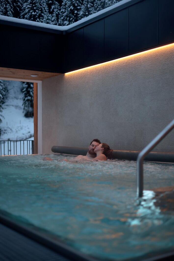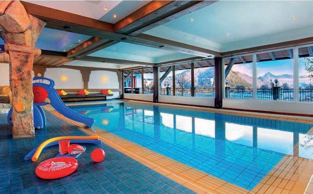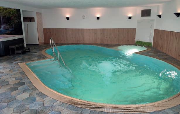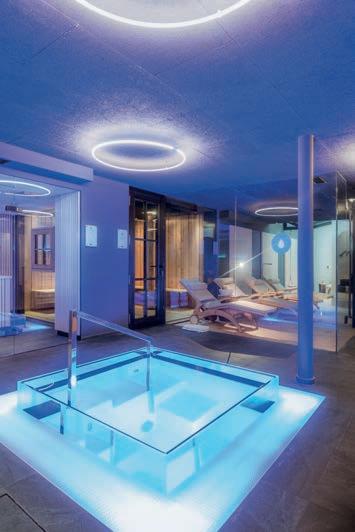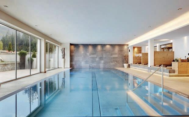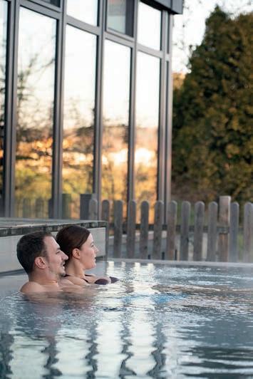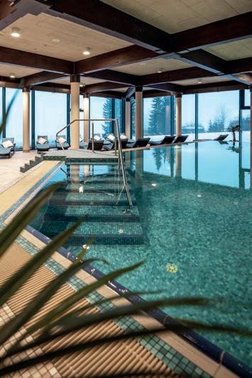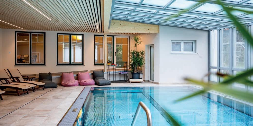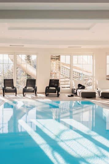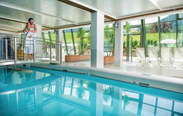 Beheiztes Innenschwimmbad mit Gegenstromanlage, Rutsche, beheiztes Panorama-Außenschwimmbad mit Ruheflächen. Massage-, Beautyanwendungen und Fitnessraum.