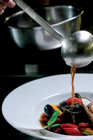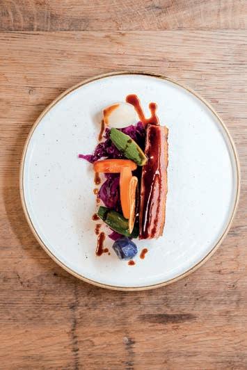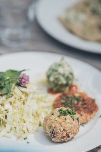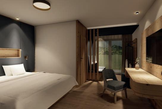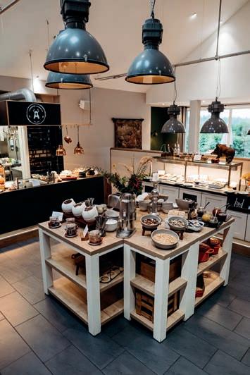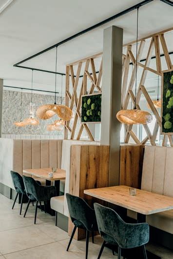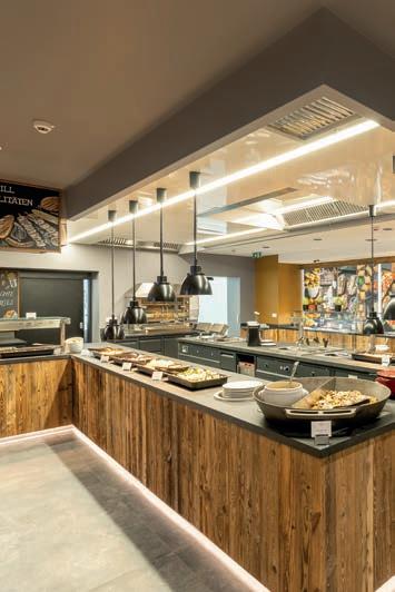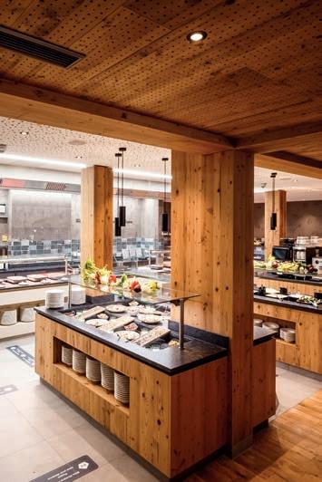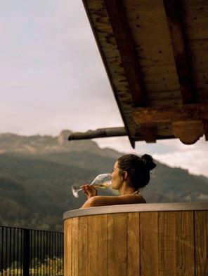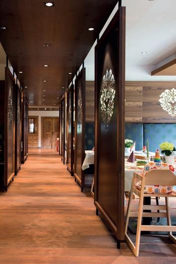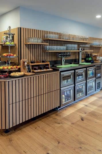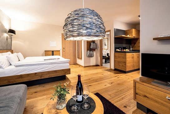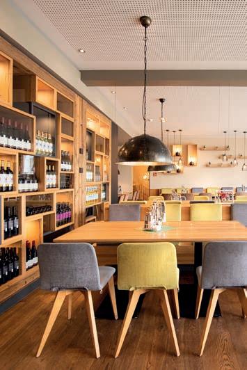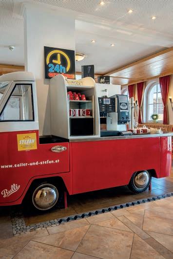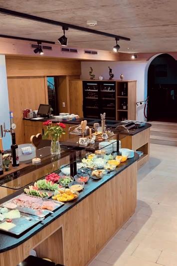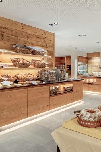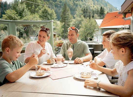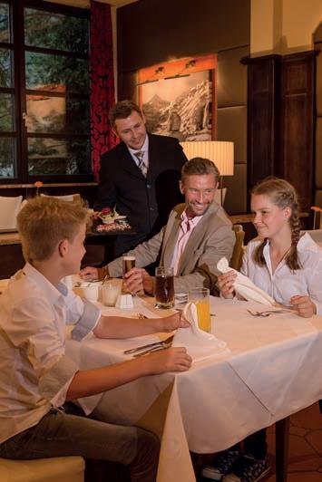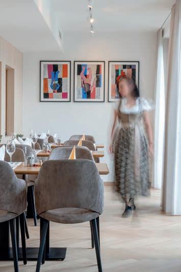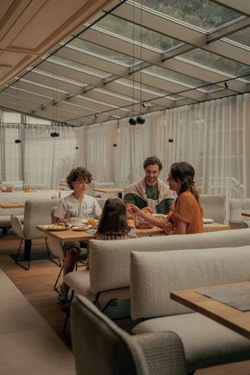 Regionale und saisonale Produkte, reichhaltiges Frühstücksbu et, Mittags- & Jausenbu et, feines 5-GangAbendmenü am Tisch serviert, gemütliche Kaminbar und Sonnenterrasse. Ganztägig Ka ee-, Teeund Saftbar.