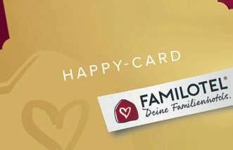 Unsere Happy-Card lohnt sich oft schon bei der ersten Reise. Du profitierst mit der Familotel Kundenkarte von vielen Vorteilen und exklusiven Angeboten. Bestelle dir jetzt gleich deine Happy-Card „Starter“ und genieße drei Jahre lang alle Vorteile zum einmaligen Preis von 99 €. Unsere Happy-Card erhältst du digital für deine Wallet-App. www.familotel.com/happy-card