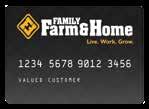 †Subject to credit approval. To earn rewards, Family Farm & Home Credit Cardholders must be enrolled in Homegrown Rewards®. Enrolled Family Farm & Home Credit Cardholders earn 25 Homegrown Rewards® points per dollar spent in store. Receive a $5 rewards certificate for every 2,500 points earned; this is a $5 rewards certificate for every $100 spent in store (i.e. 5% Back). Rewards are not earned on Special Financing purchases. Family Farm & Home reserves the right to change or cancel the terms and conditions of the Homegrown Rewards® program and any associated offer(s) at any time without prior notification. See Homegrown Rewards® Terms & Conditions or details at https://rewards.familyfarmandhome. com/program-terms-conditions