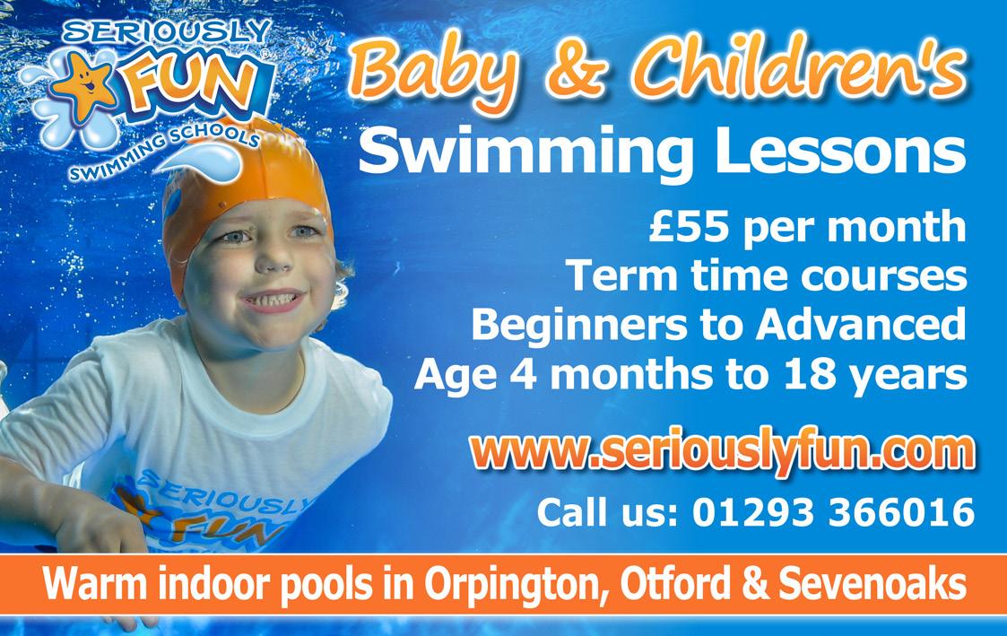 Millennium Minnows Swim School, Bromley, 4.5 yrs to adults, tel 07794 304 717 Seriously FUN Swimming Schools, Orpington, Sundridge, Oxted, 4 months - 12 yrs, tel 01293 366016