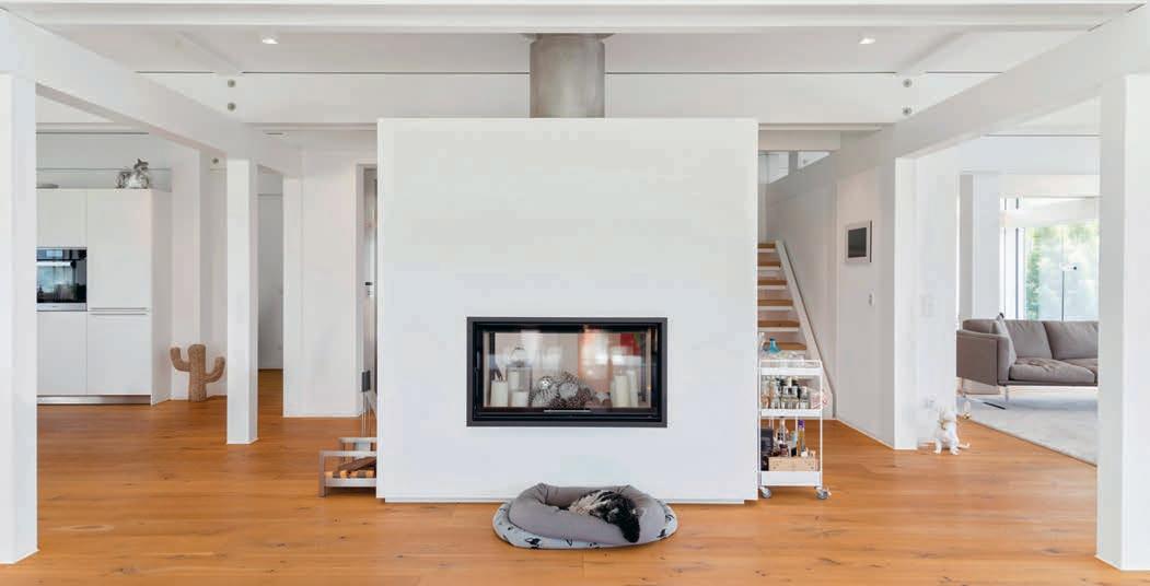 Durch den mittig platzierten Kaminofen gelangt die Wärme auch ins Treppenhaus.