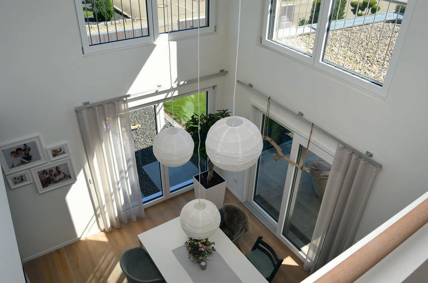 Durch den Luftraum und die Dachverglasung wirkt der Bereich rund um den Esstisch luftig und großzügig.