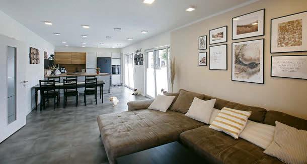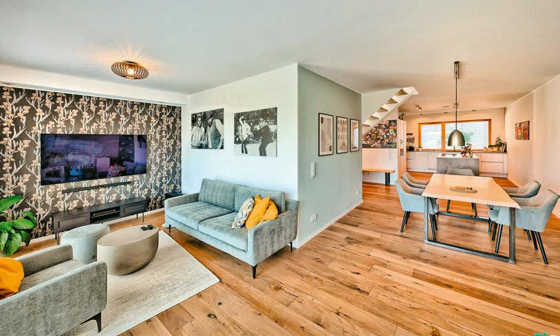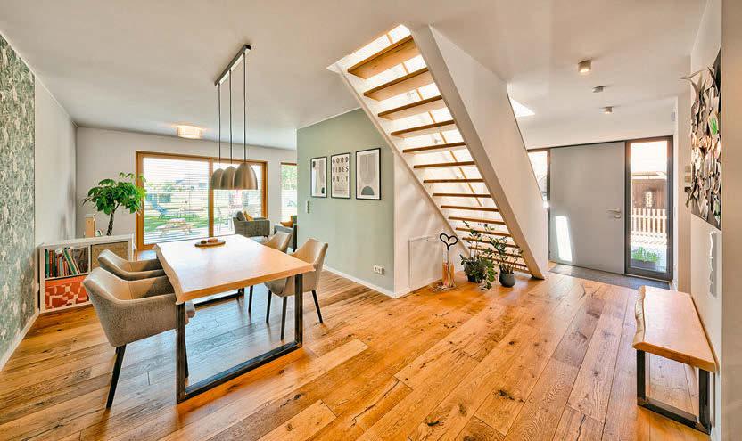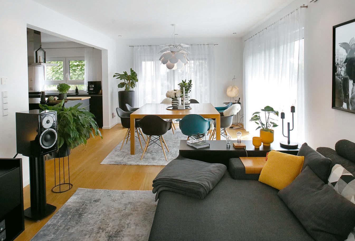 Von der Haustür geht’s, vorbei an Wangentreppe und Esstisch, ums Eck zur Sofaecke. Knapp 53 Quadratmeter misst der offene Wohnbereich im Erdgeschoss.