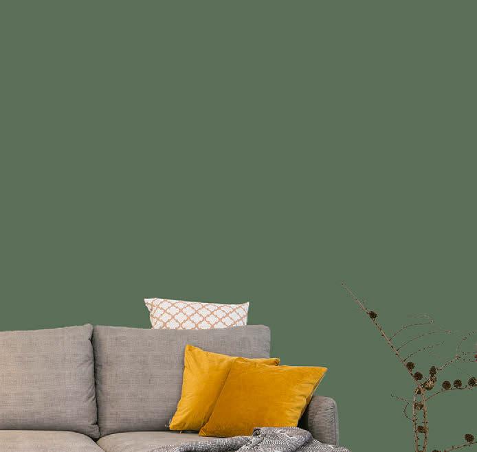 Bud Spencer und Terence Hill blicken skeptisch in den Wohnbereich. Ob ihnen das Muster der Tapete zu wild ist? Wir finden, es harmoniert super mit Wand- und Sofafarbe.